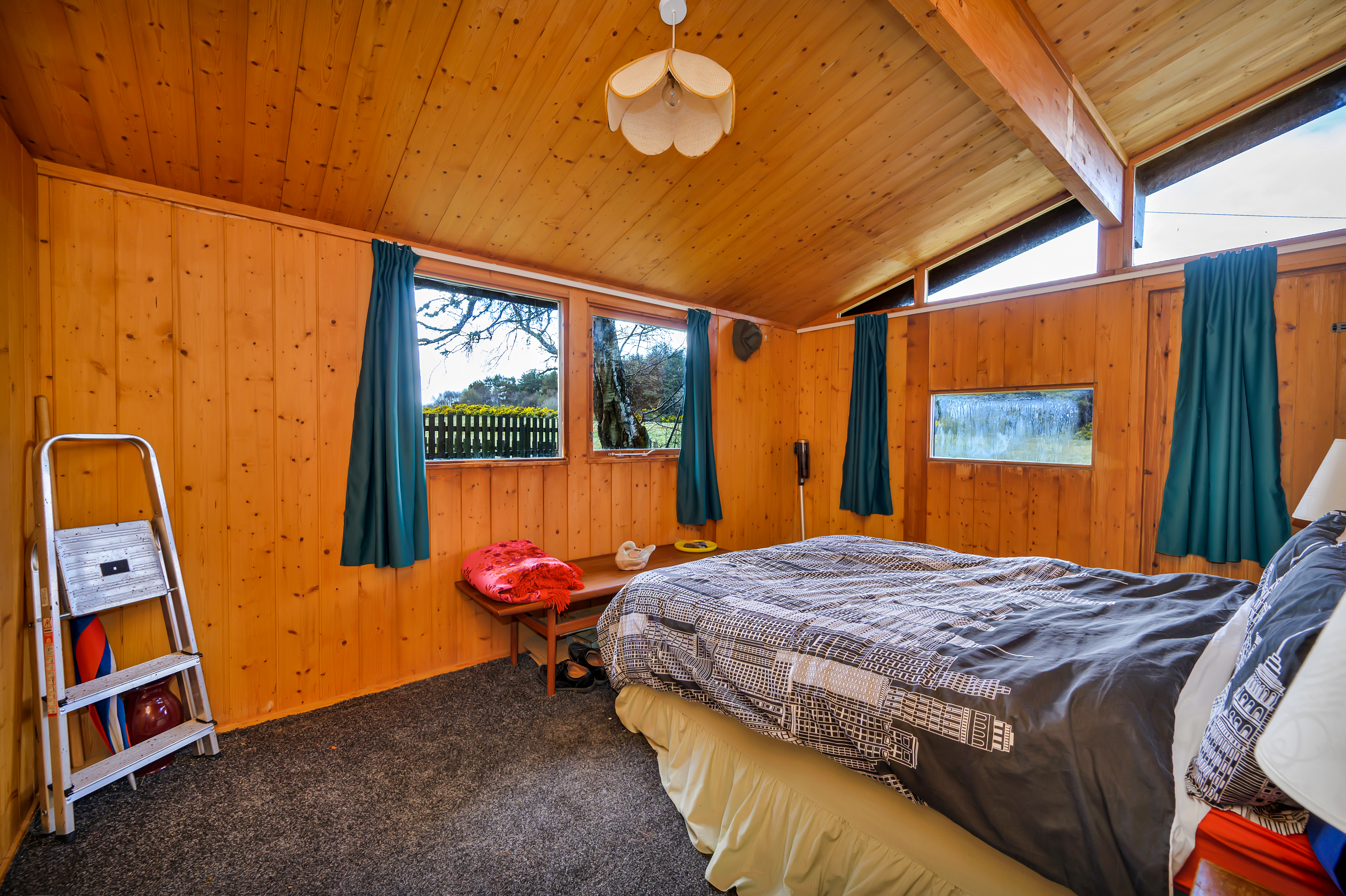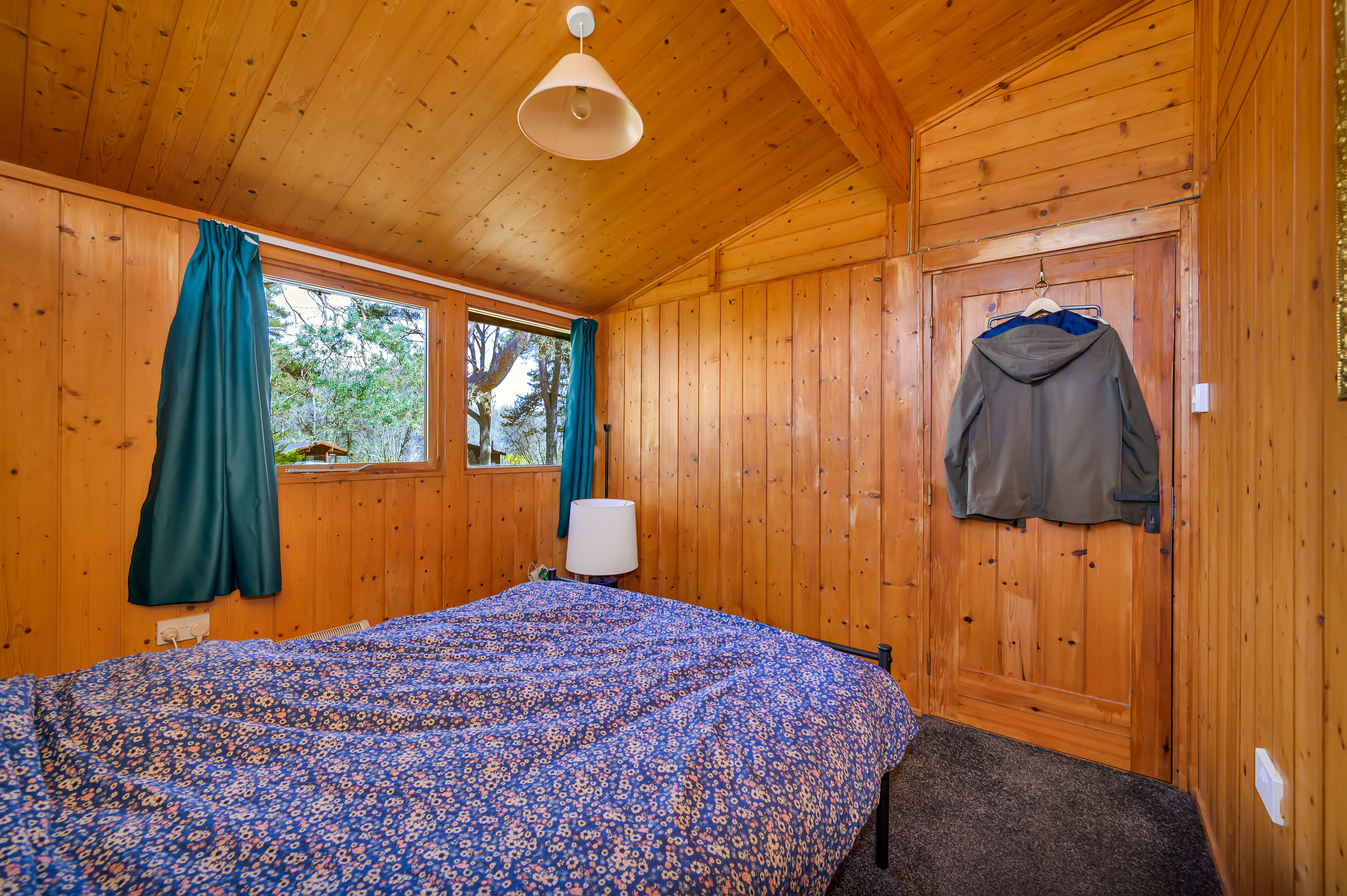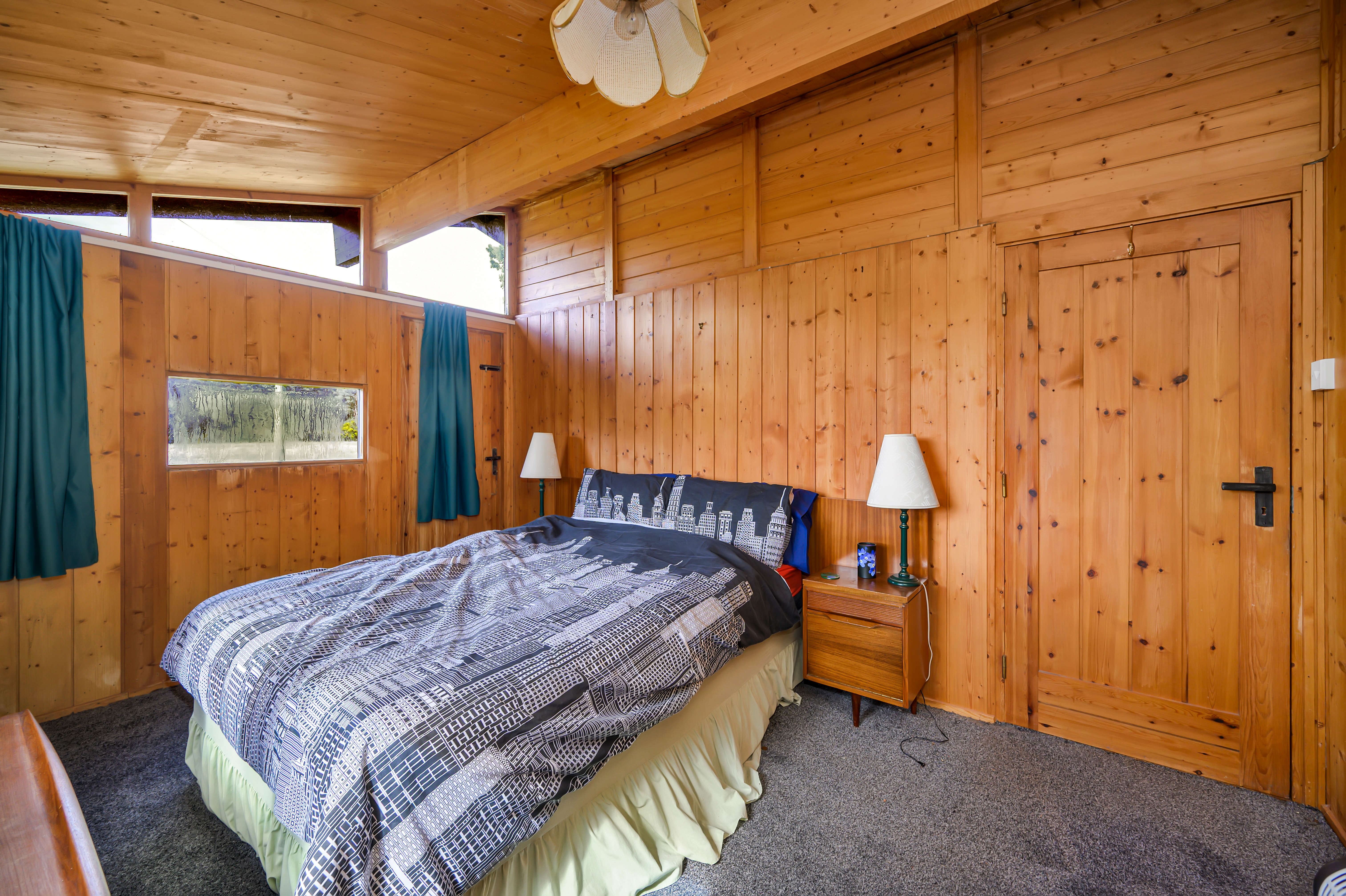 Rear and side facing windows. Walls and ceiling are lined with pine panelling. Carpet. Curtains.