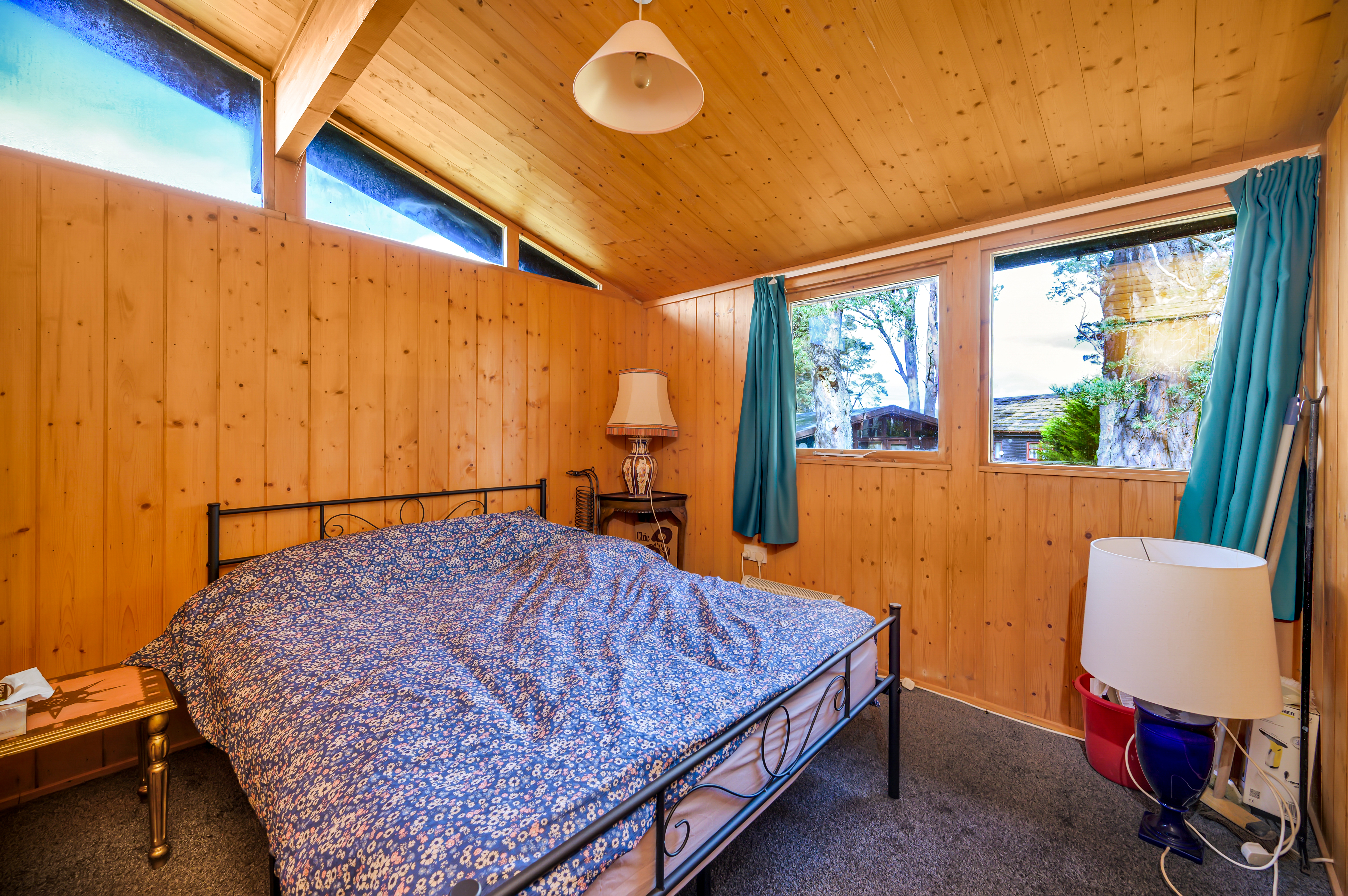Front and side facing windows. Walls and ceiling are lined with pine panelling. Carpet. Curtains.
