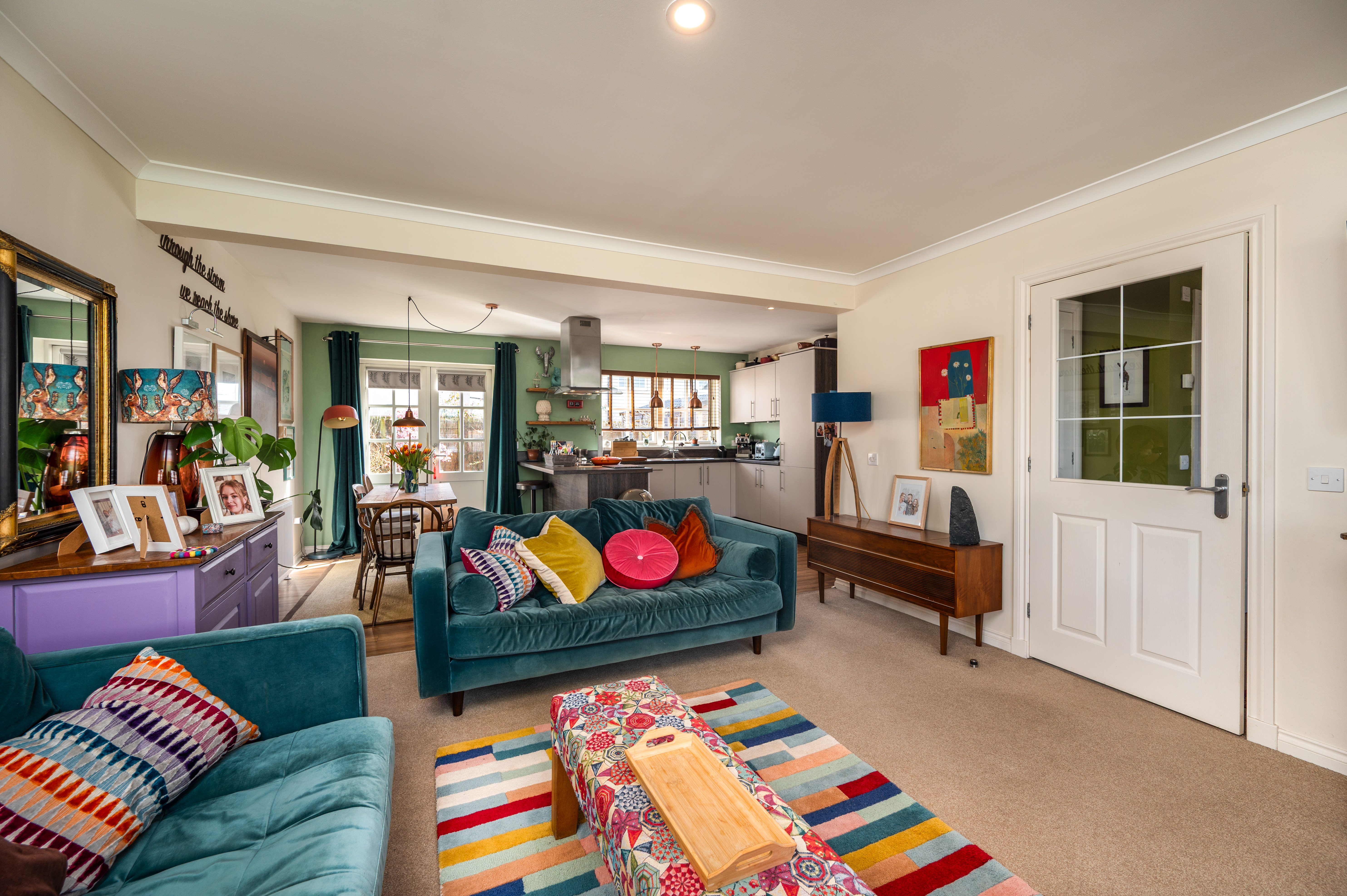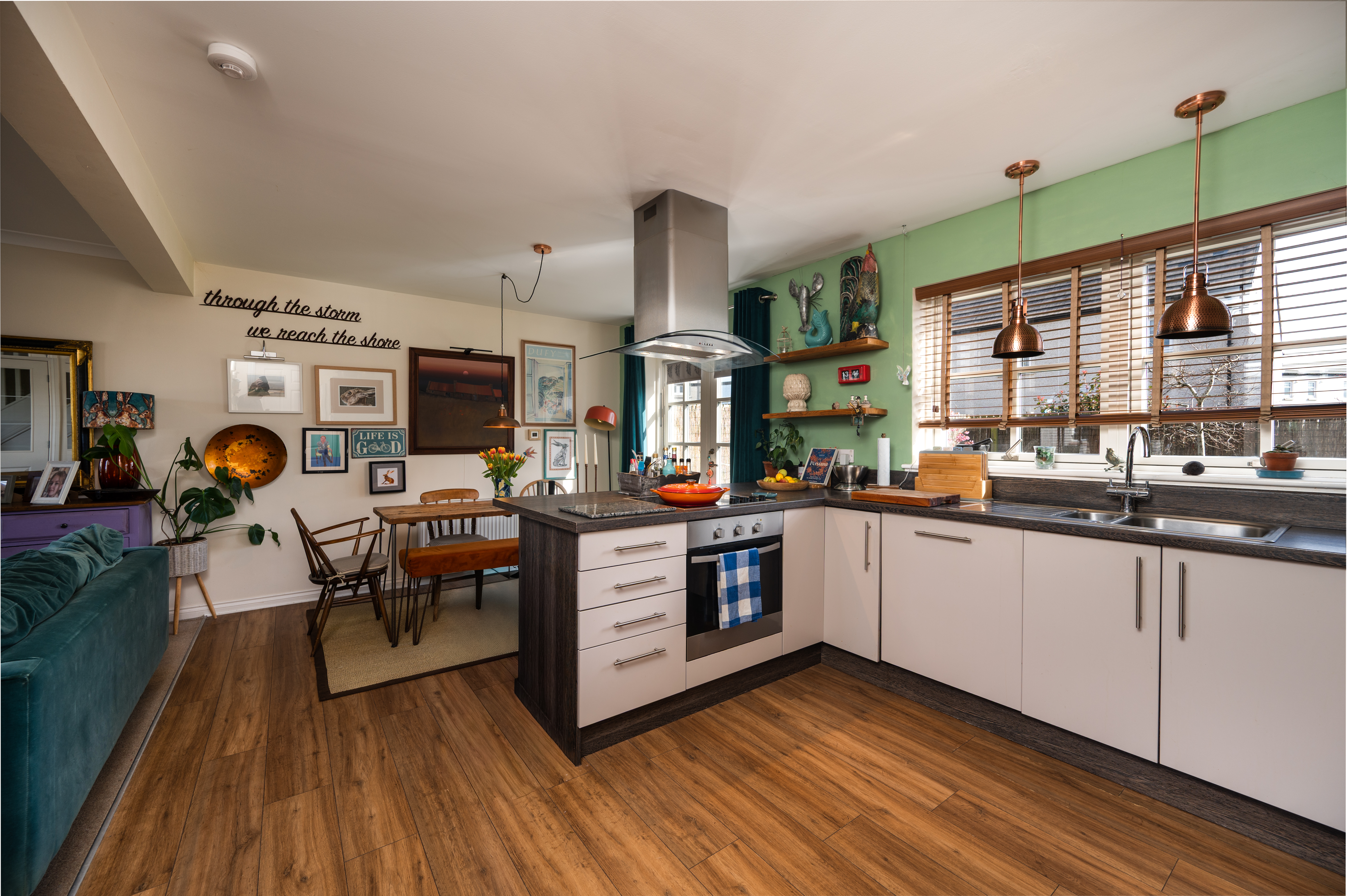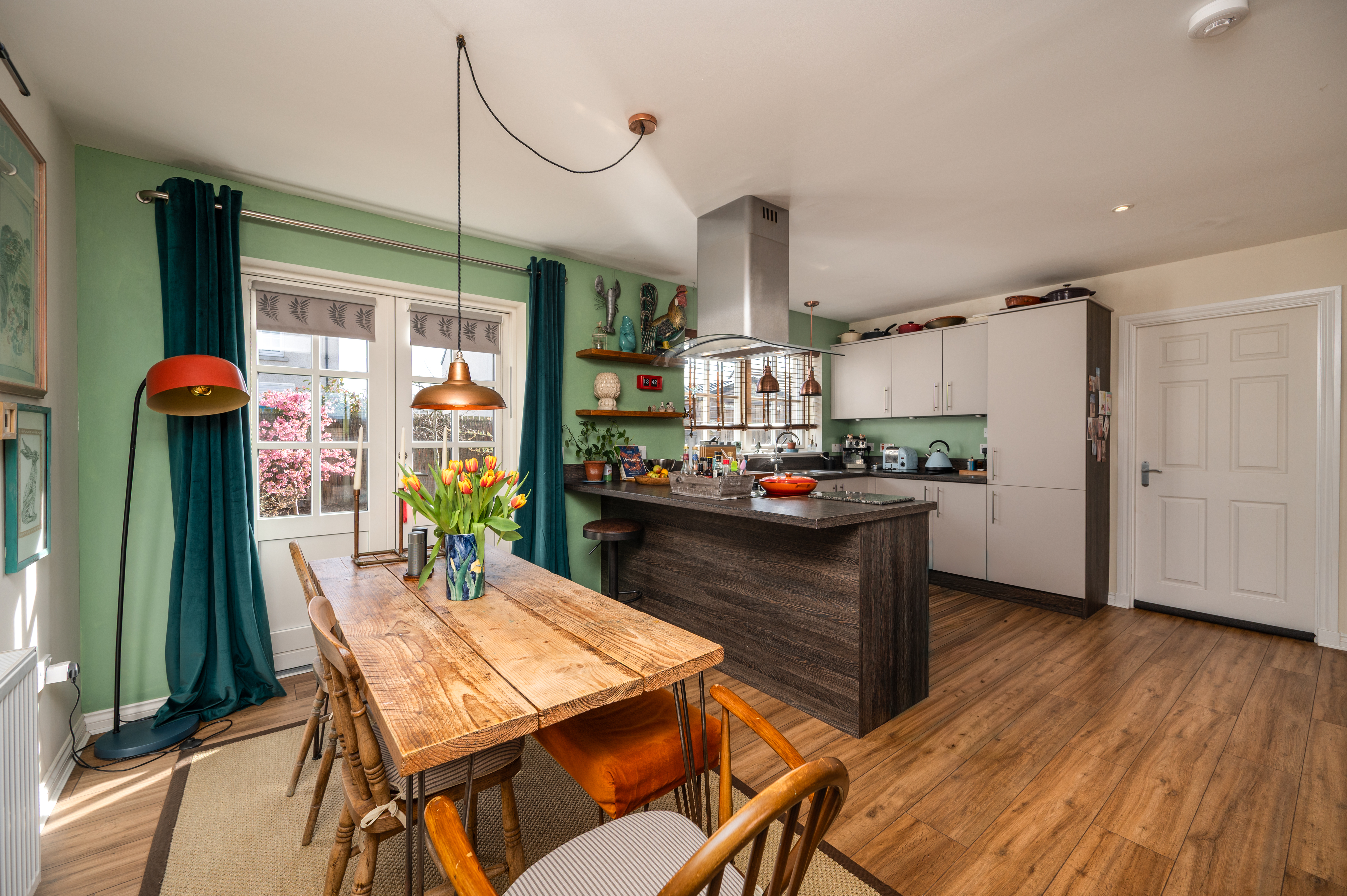 Nicely proportioned room with the living room enjoying a front facing window, fitted with venetian blinds. Carpet. Radiator. Ceiling light. The kitchen is fitted with a number of wall and base units providing ample storage and incorporates an electric hob and oven, with extractor chimney hood above, and integrated dishwasher and larder fridge. 1.5 sink and drainer with mixer tap. Work surface. Breakfast bar. Wall shelving. Rear facing window fitted with wood venetian blinds. Laminate flooring. Feature drop ceiling lights. The dining area enjoys double patio doors, with roller blind and curtains, which lead out to the rear garden. Feature drop ceiling light over table area. Laminate flooring. Radiator.