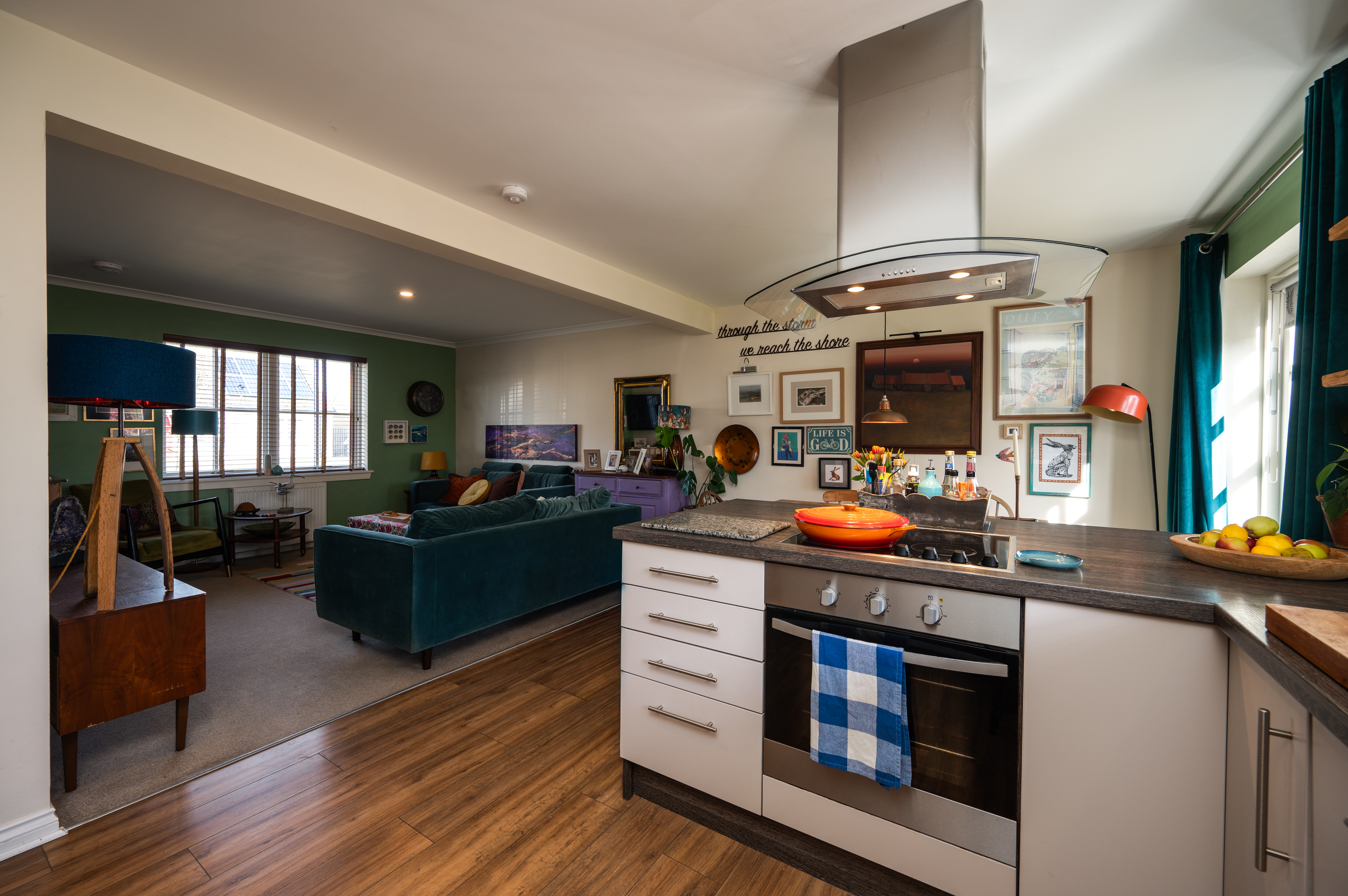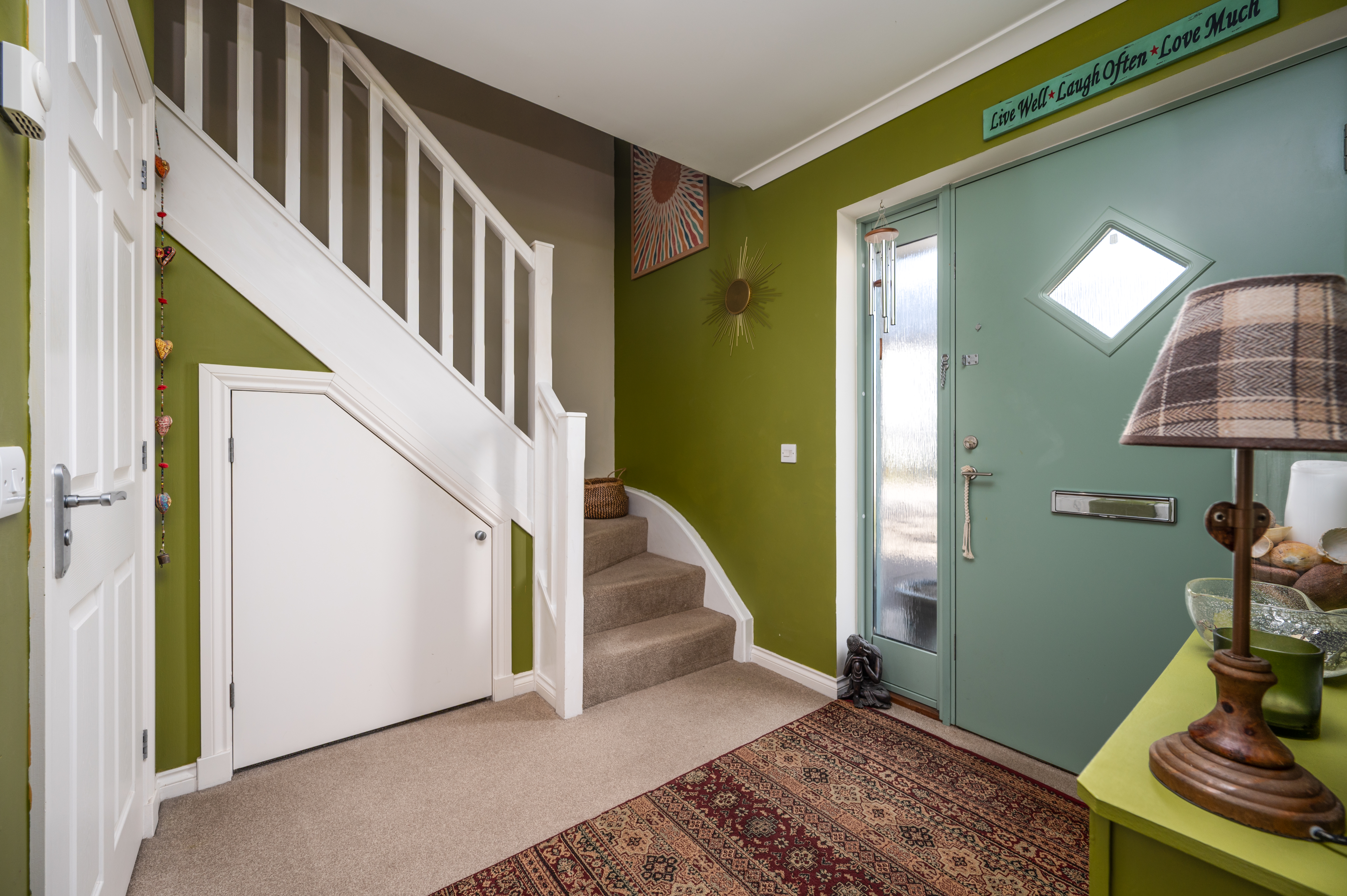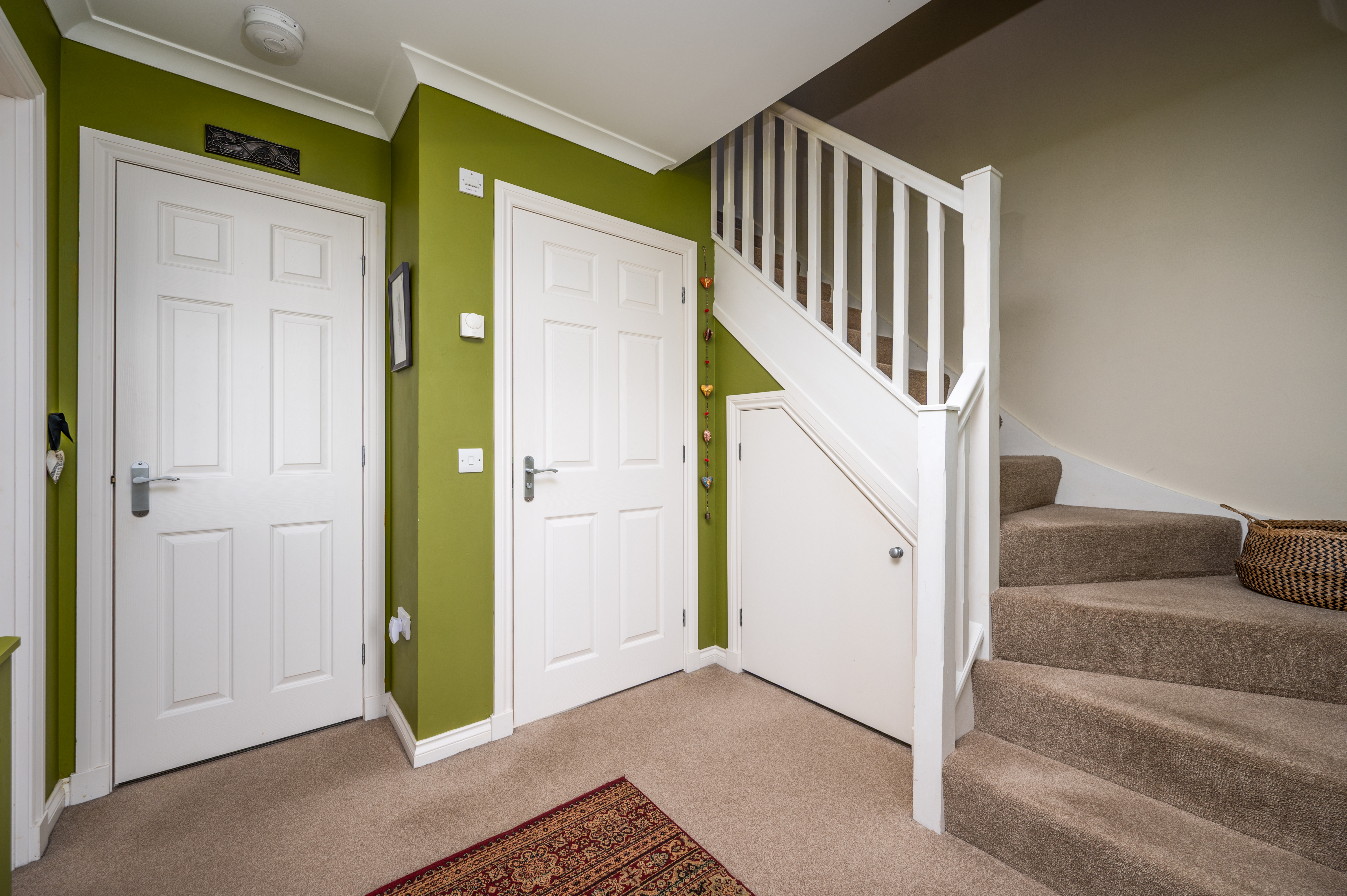 Access is given to open plan living room/kitchen/dining area and WC. Door into a shelved storage cupboard. Carpeted stairs leads up to the landing. Under-stairs storage cupboard housing the electric consumer unit. Radiator. Carpet. Recessed ceiling light.
