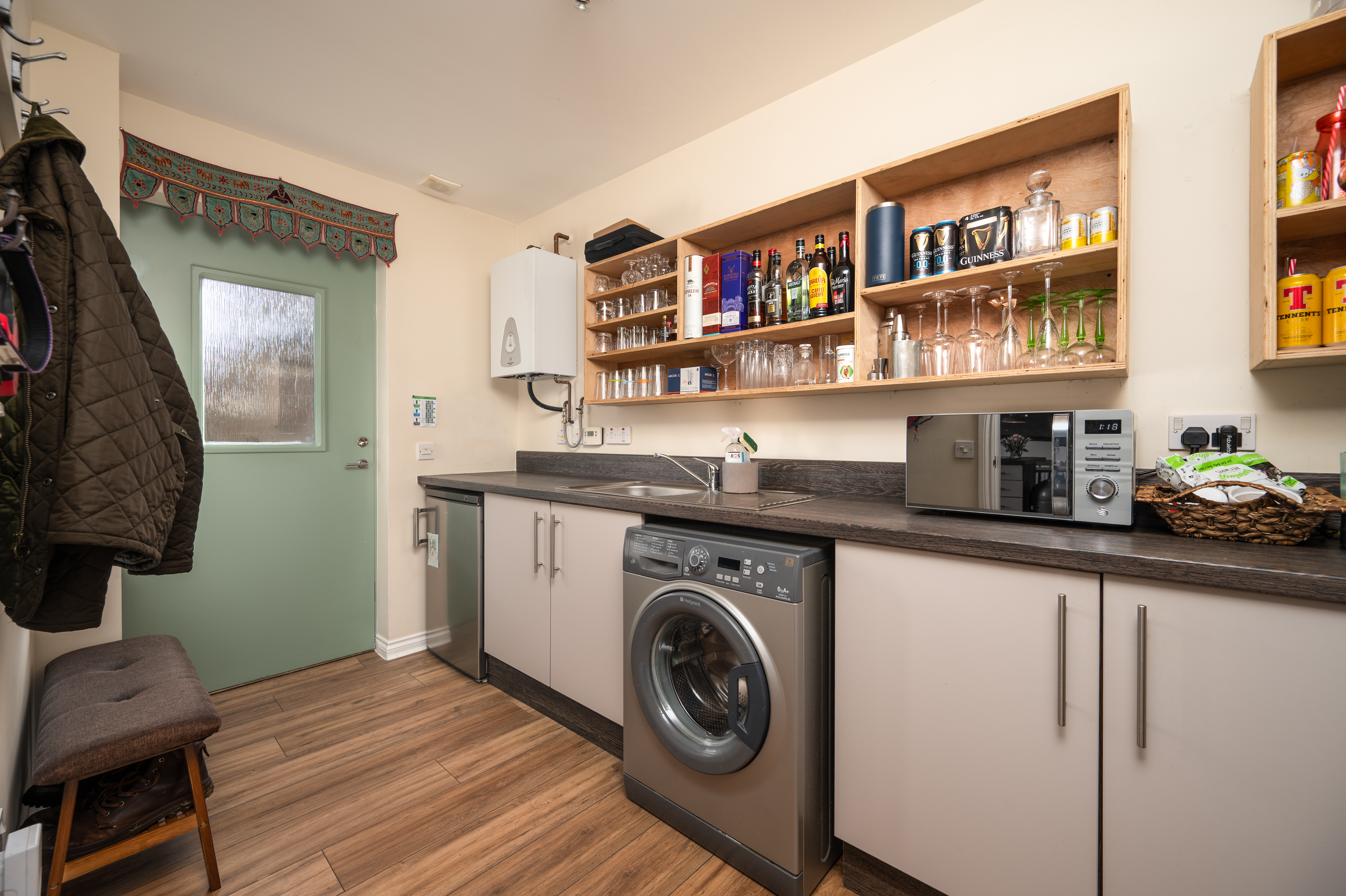 This practical room enjoys a number of base units and incorporates a single sink and drainer with mixer tap. Work surface with matching splash-back. Plumbed for washing machine. Space for under-unit single freezer. Wall mounted electric boiler. Laminate wood flooring. Radiator. Fitted coat hooks. External door leads out the fully enclosed rear garden.