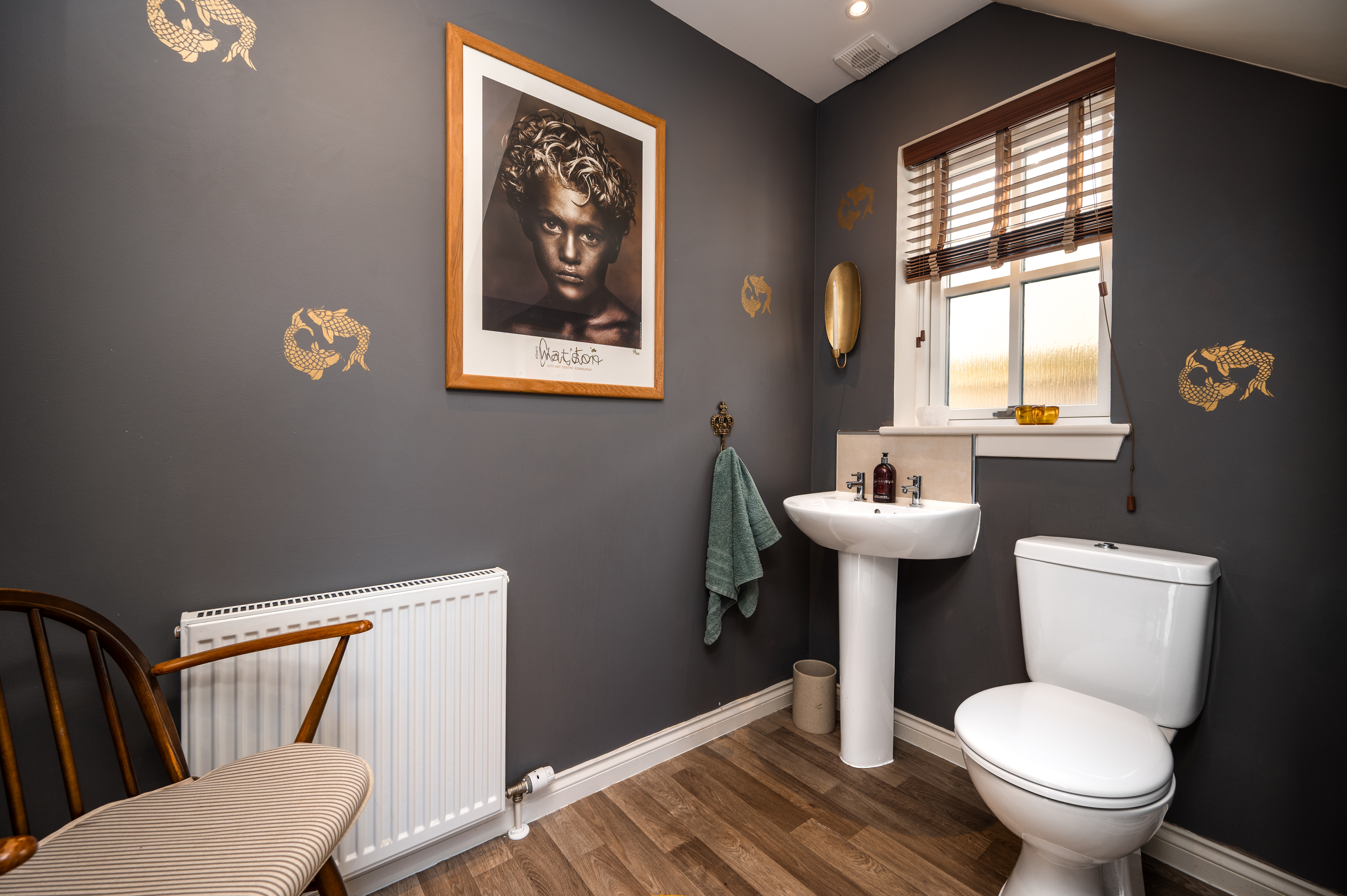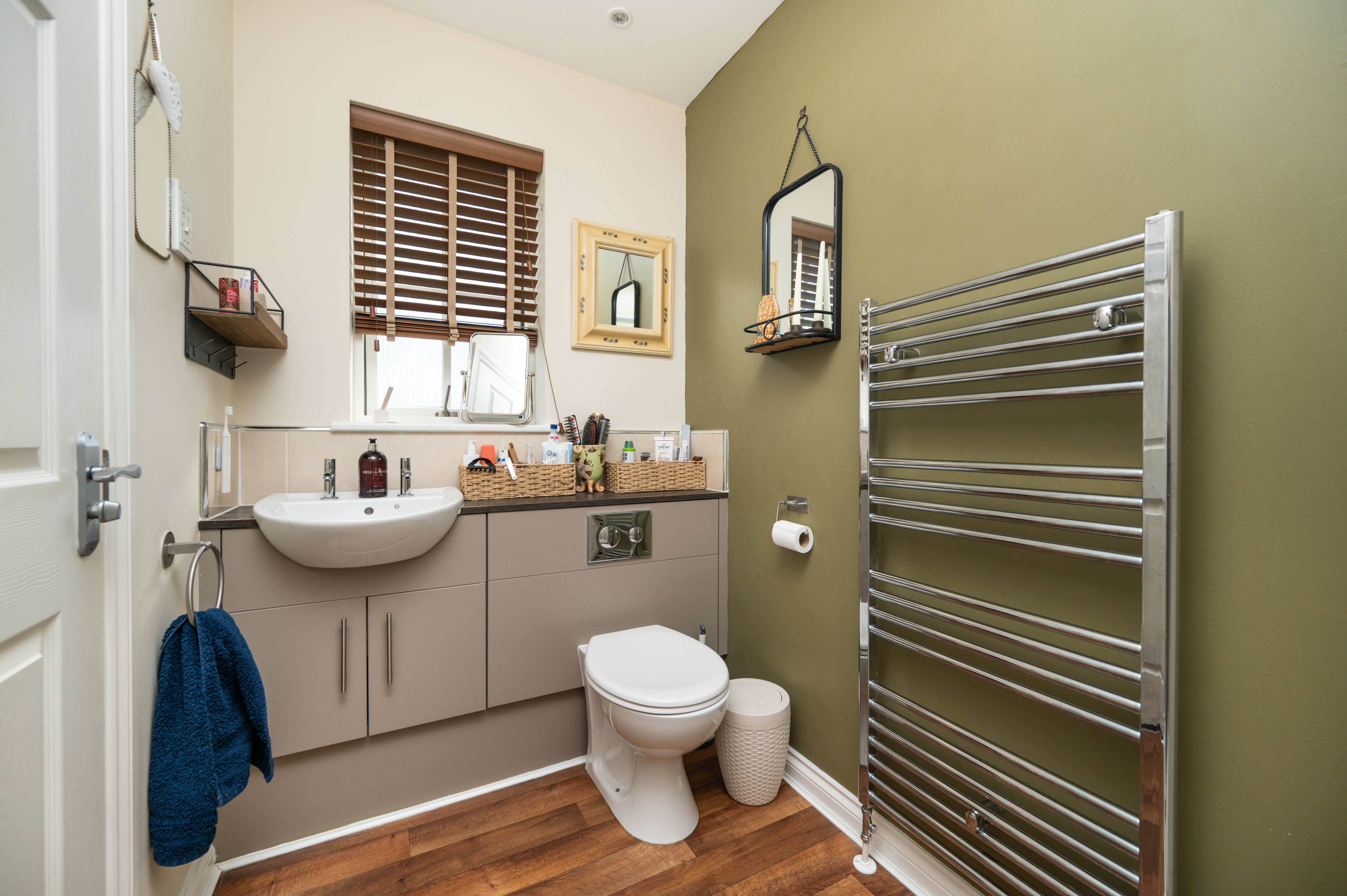 Comprising WC and wash hand basin. Side facing opaque window with fitted wood venetian blind. Vinyl flooring. Radiator.