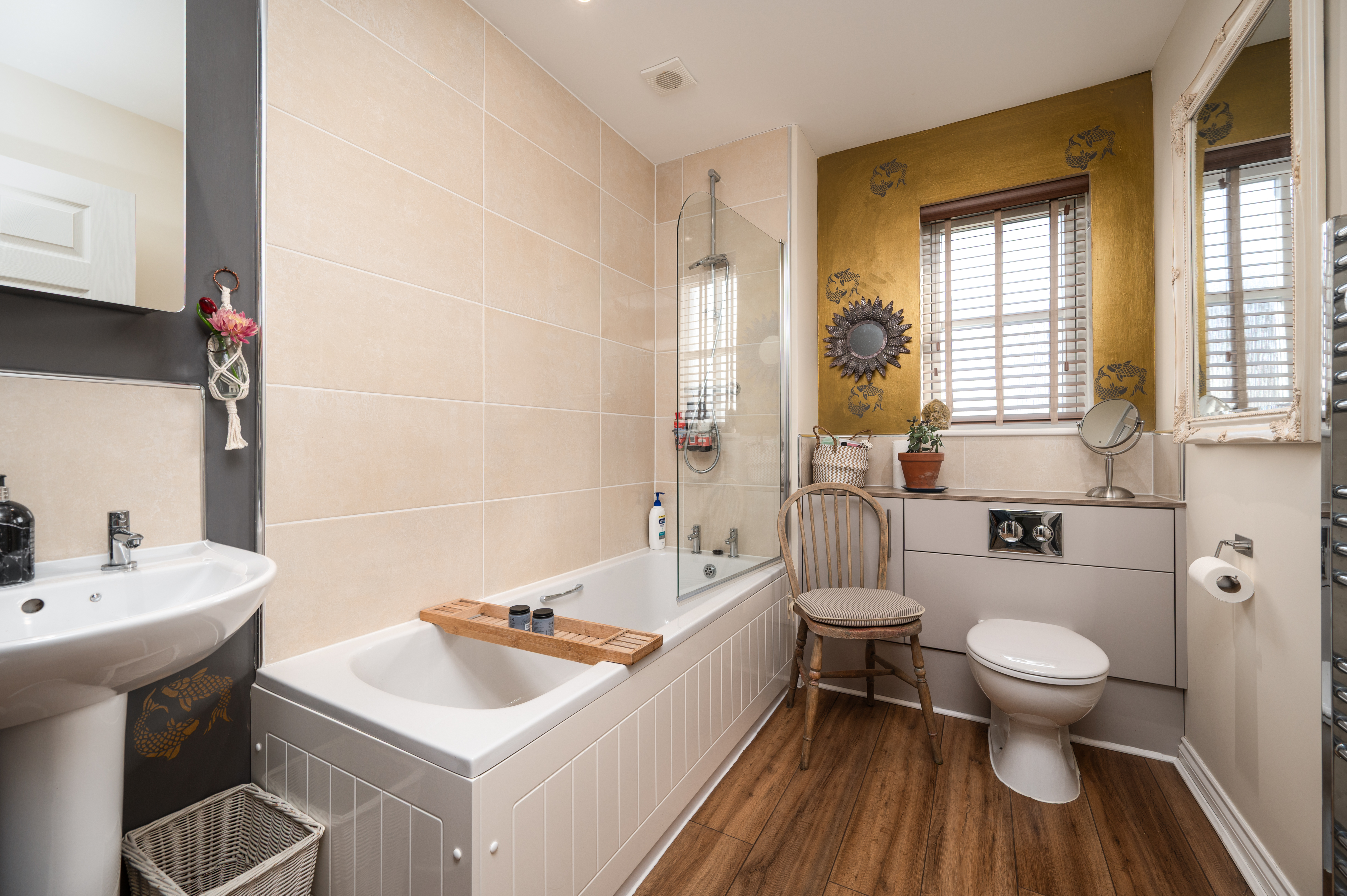 Comprising built-in WC with display work top and storage cupboard, wash hand basin, and bath with shower over. Walls partially tiled. Mirrored wall cabinet. Rear facing window fitted with wood venetian blind. Chrome ladder style heated towel rail. Laminate wood flooring. Extractor fan.
