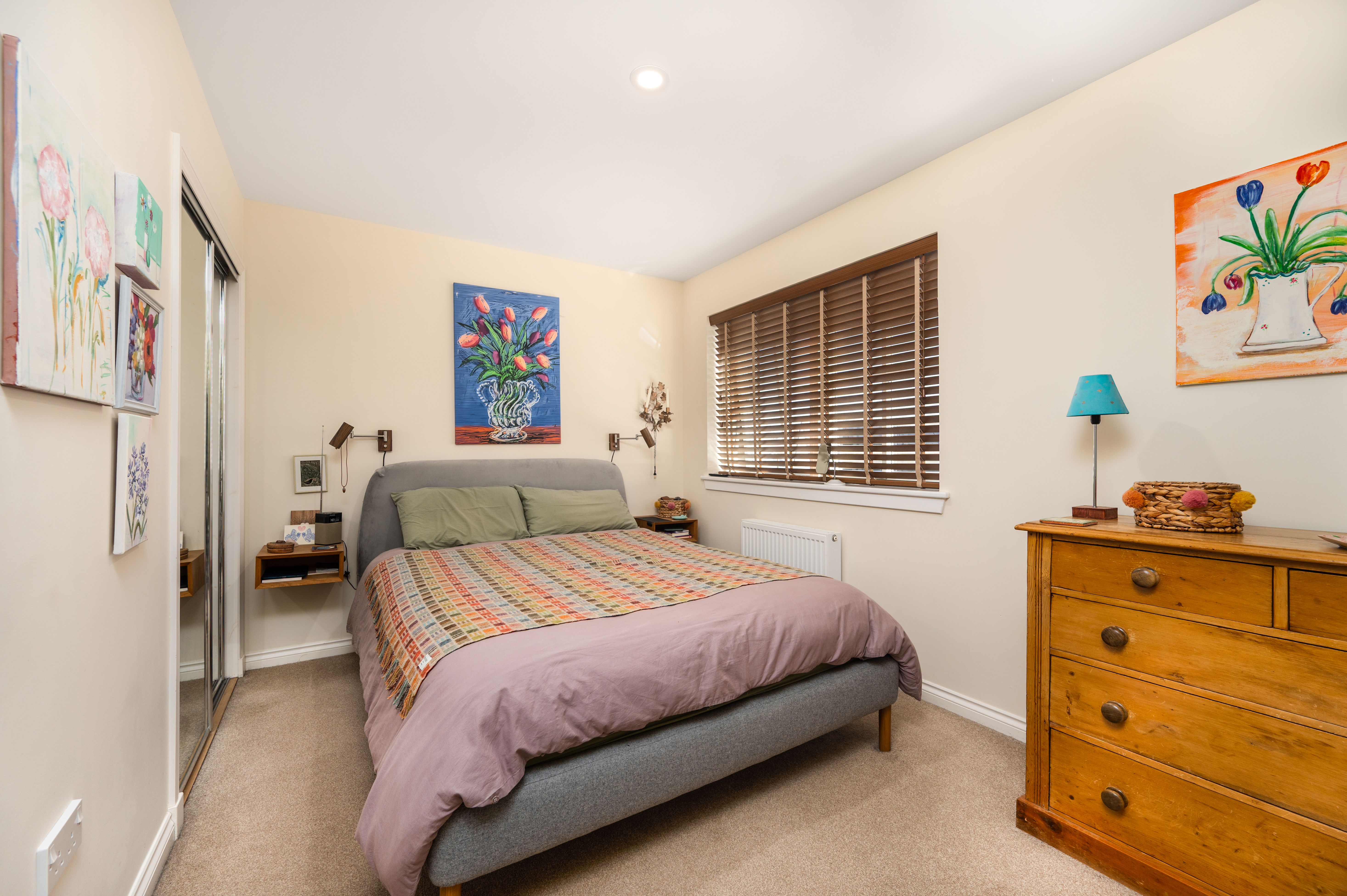 Nicely proportioned and bright room enjoying a front facing window fitted with wood venetian blind. Fitted wardrobes with double mirrored doors. Carpet. Recessed ceiling light.