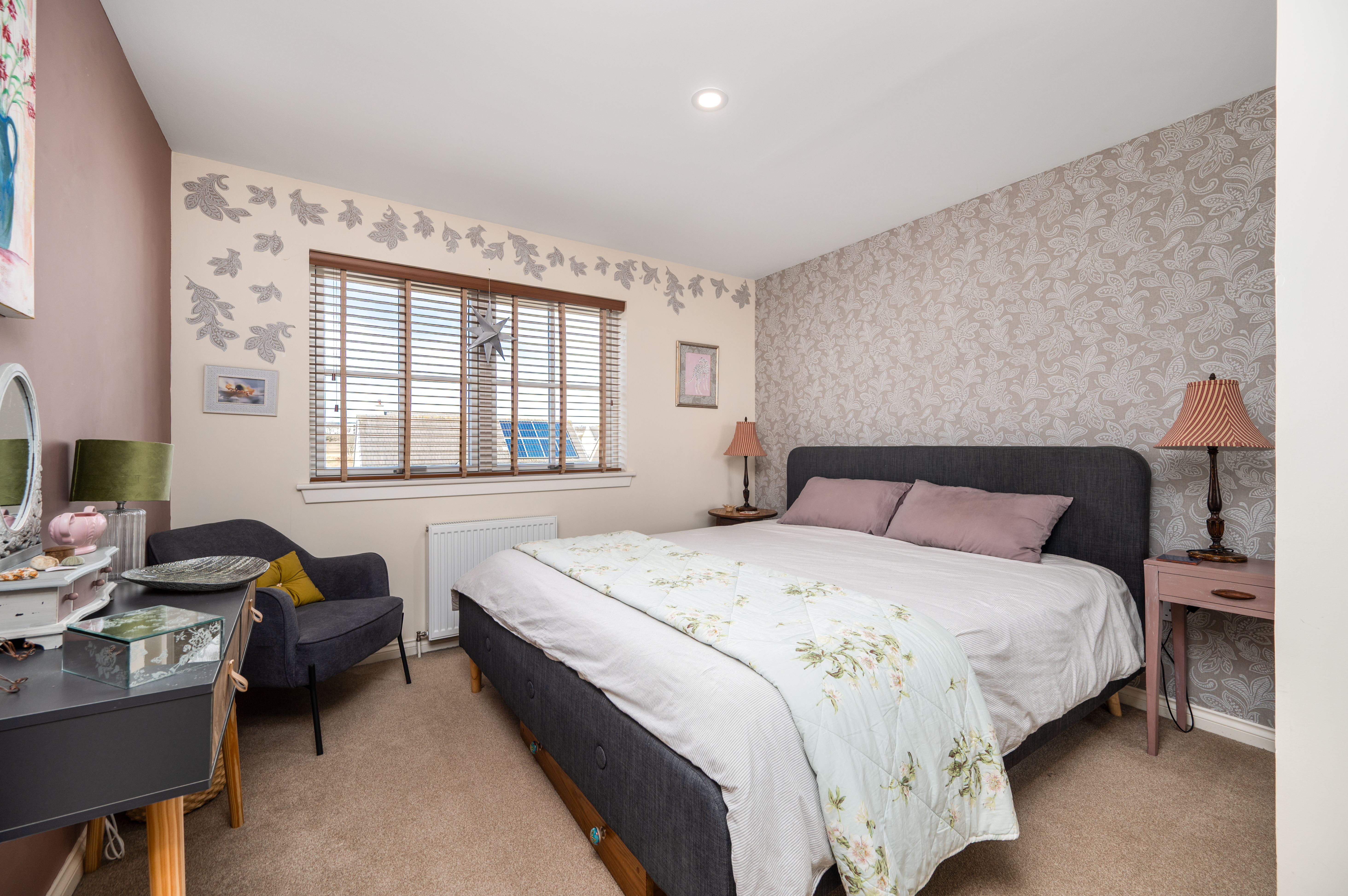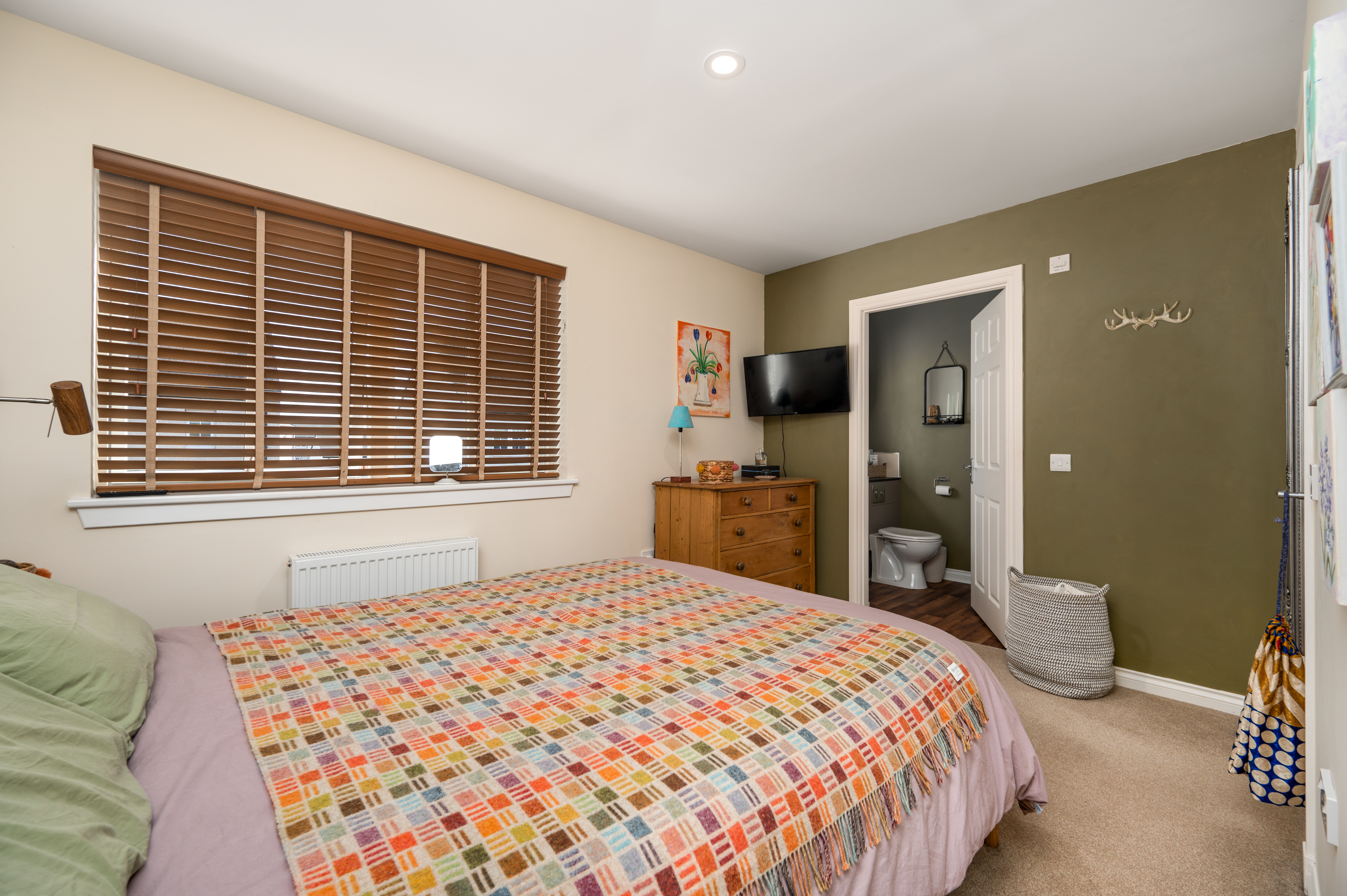 Nicely proportioned room enjoying rear facing window fitted with wood venetian blind. Fitted wardrobes with double mirrored doors. Recessed ceiling light. Bedside wall lights. Carpet. Radiator. Door into En-suite.