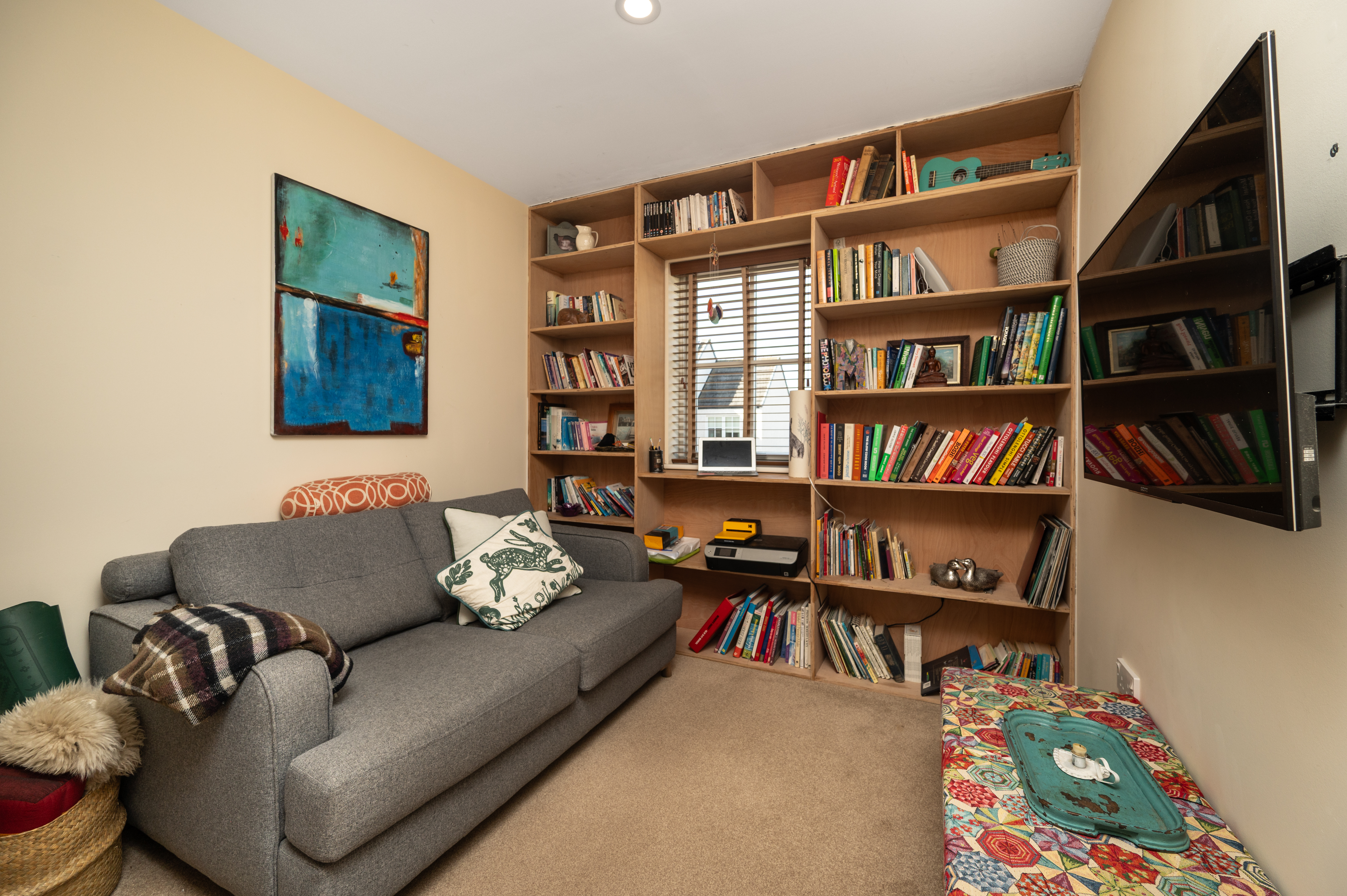 Currently used as a snug/study, this third bedroom enjoys a front facing window fitted with wood venetian blind. Extensive wall shelving. Door into wardrobe. Carpet. Radiator.