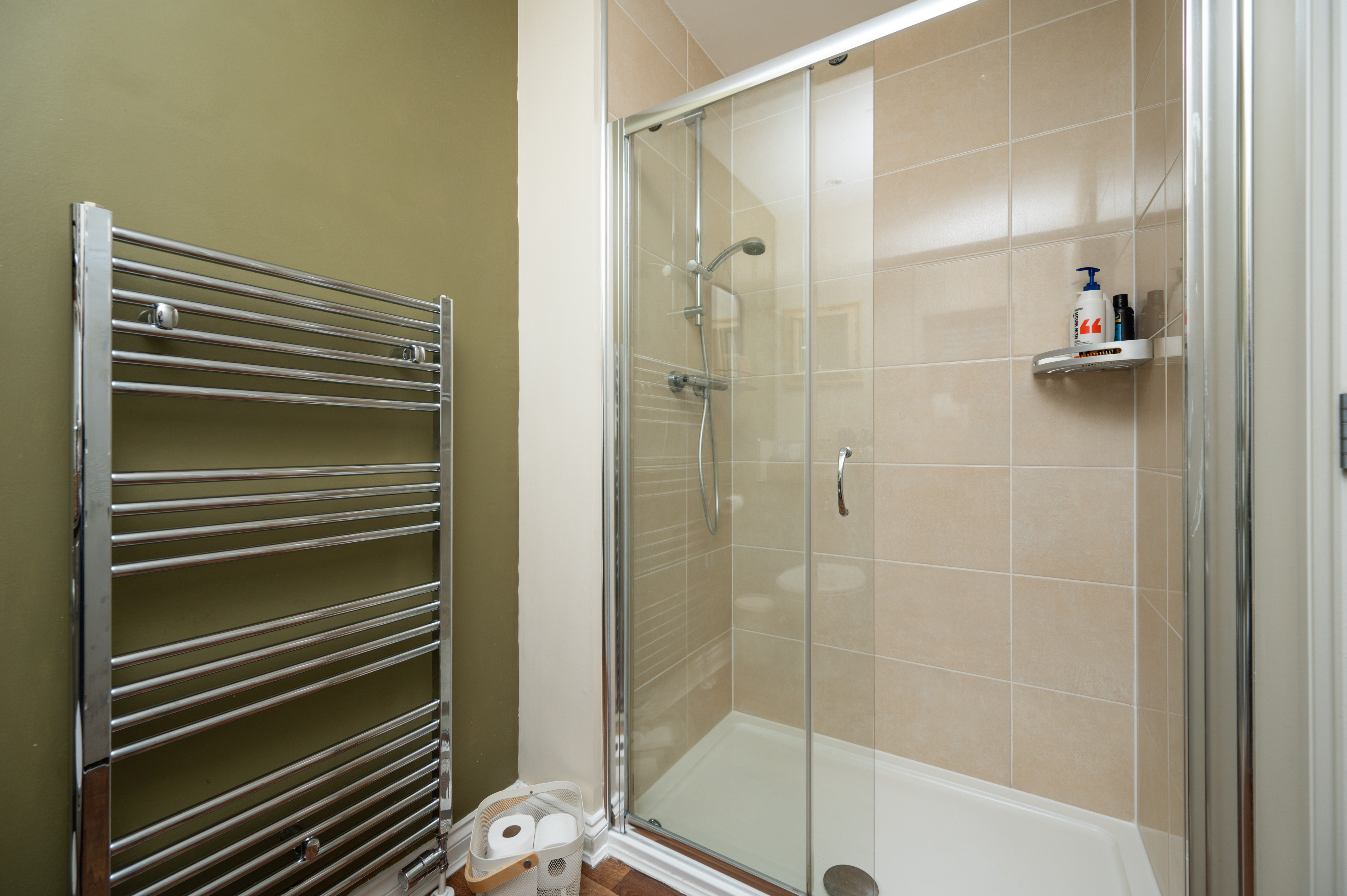 Comprising built-in WC and vanity wash hand basin with display work top and cupboard under. Large, fully tiled shower cubicle. Extractor fan. Tiled splash-back. Rear facing opaque window fitted with venetian blind. Chrome ladder style heated towel rail. Shaver socket. Recessed ceiling lights.