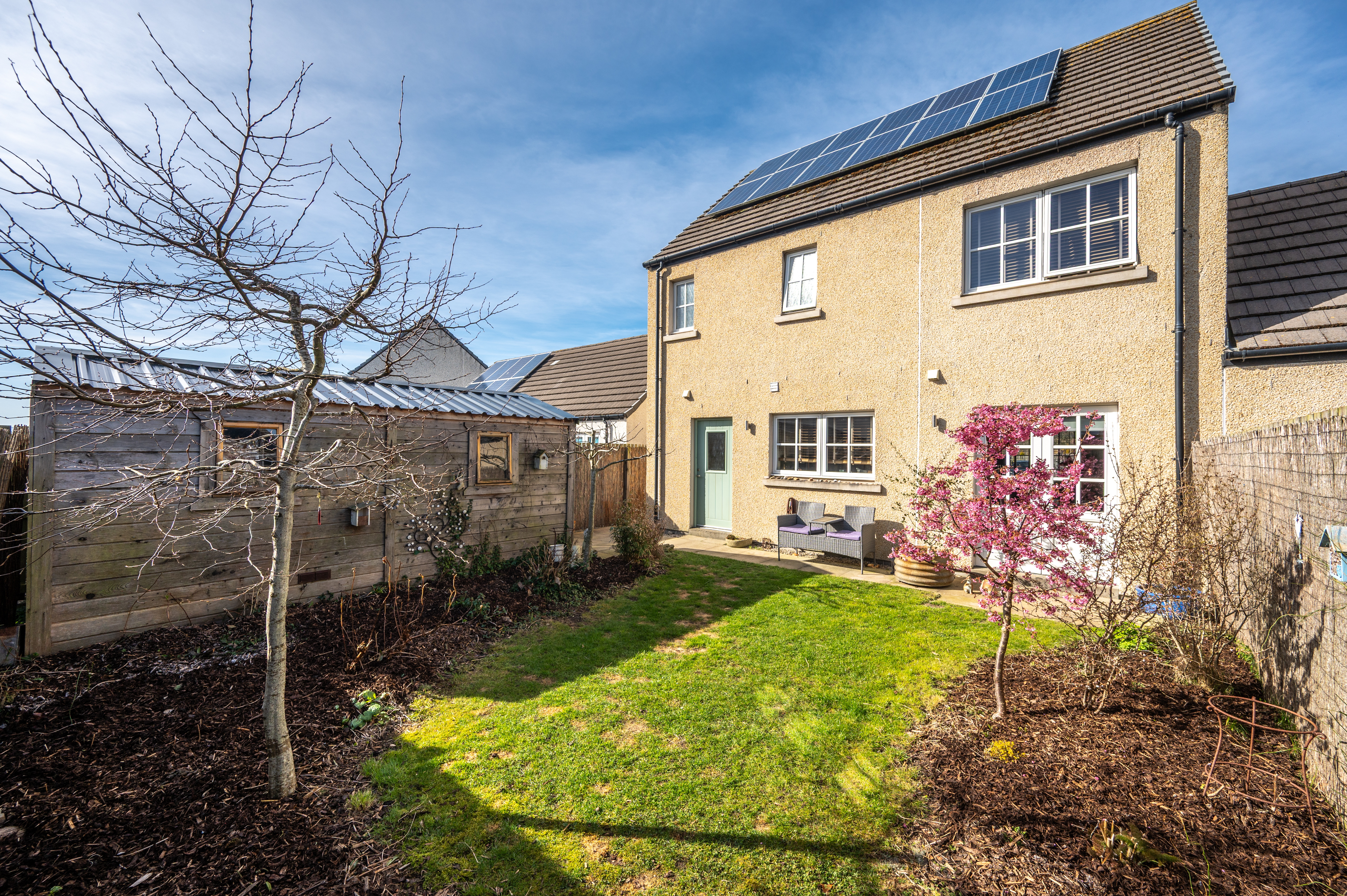 The garden ground lies to the front, side and rear of the property. To the rear is an easily maintained, fully enclosed and private garden. The front garden is open with a small grassed area and a mono block driveway providing off street parking for two vehicles. A paved pathway leads around the property. A large timber shed is provided to the rear.