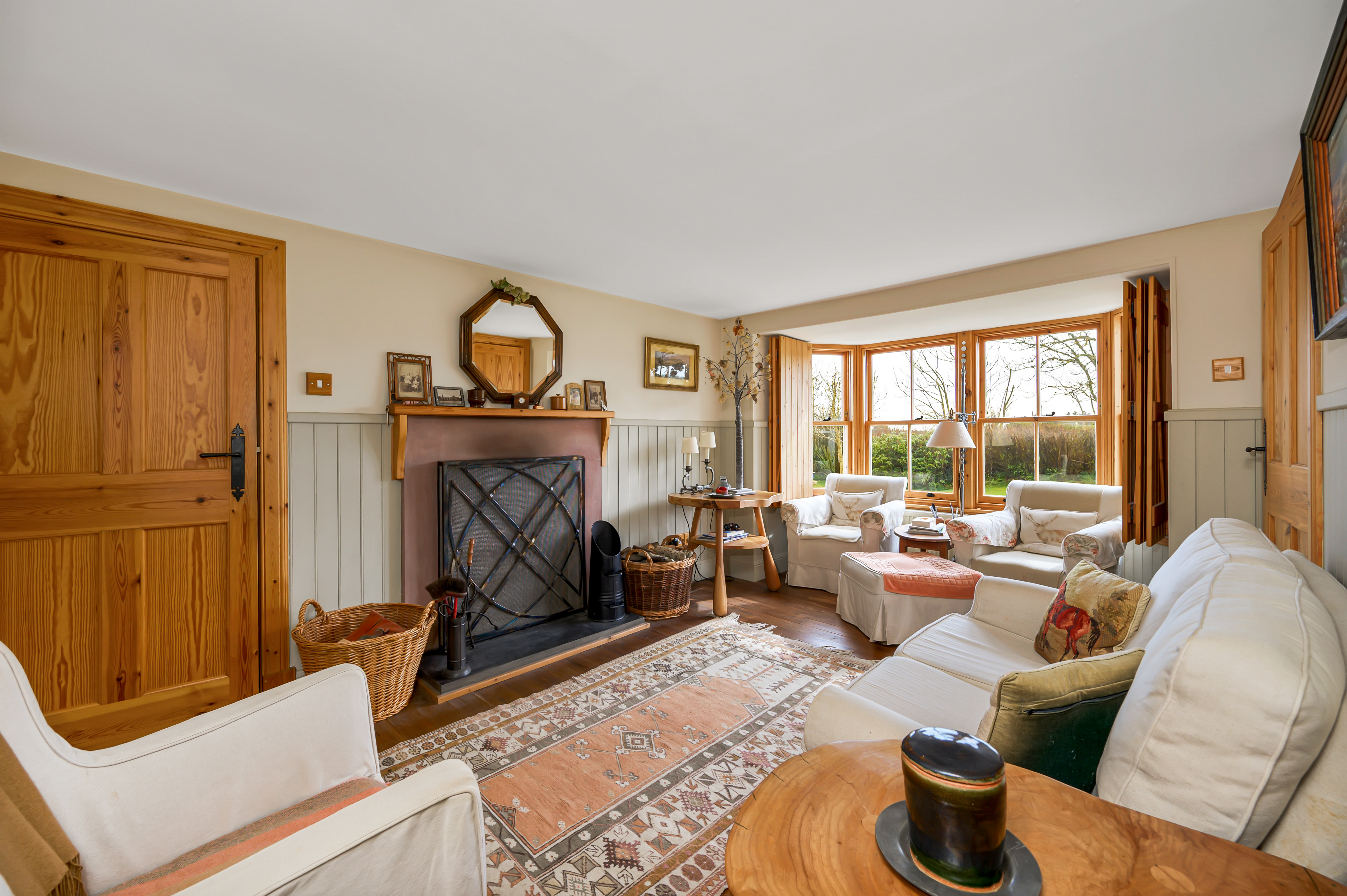 Open from the lounge, this generous dining room is ideal for family gatherings, and enjoys rear facing window over-looking farmland with fitted wooden shutters. Walls have been partially lined with painted tongue and groove wood panelling. Solid wood flooring. Access through to the study.