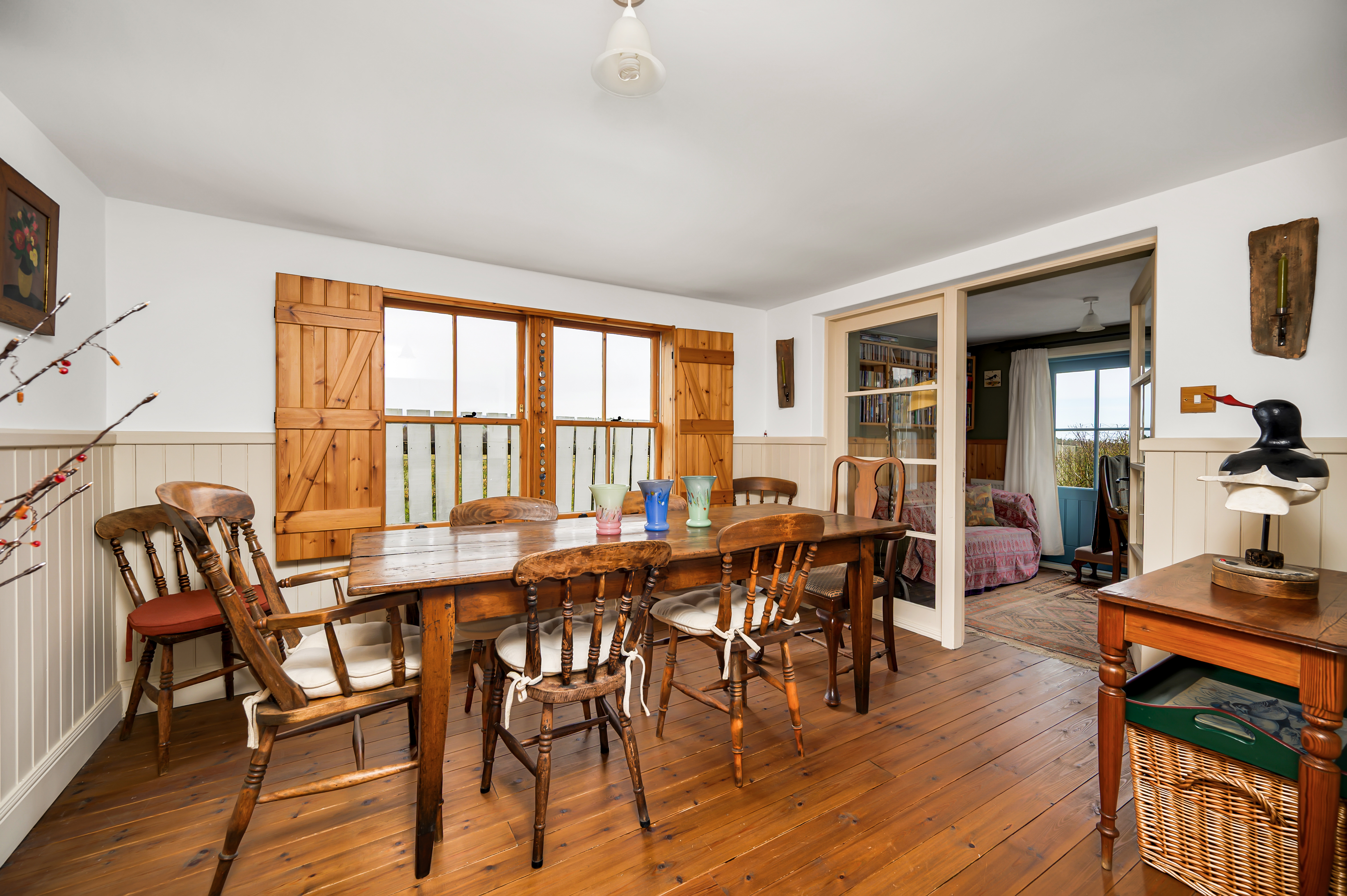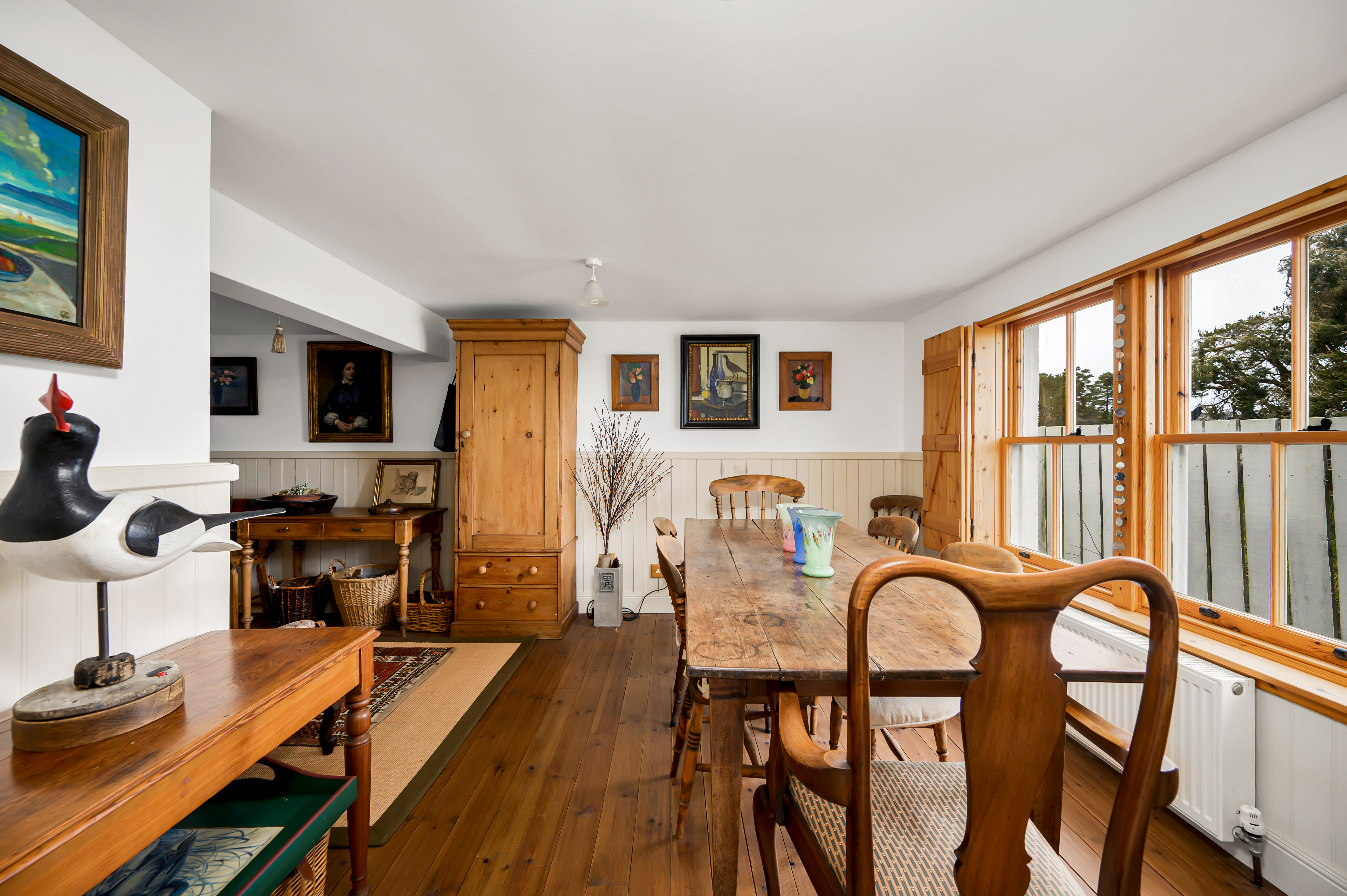 This attractive room enjoys many fine features including front facing bay window with traditional wood shutters and an open fireplace fitted with a mini range fire. Specially made fireguard. Walls have been partially lined with painted tongue and groove wood panelling. Access to dining room and kitchen. Solid wood flooring. Radiator.