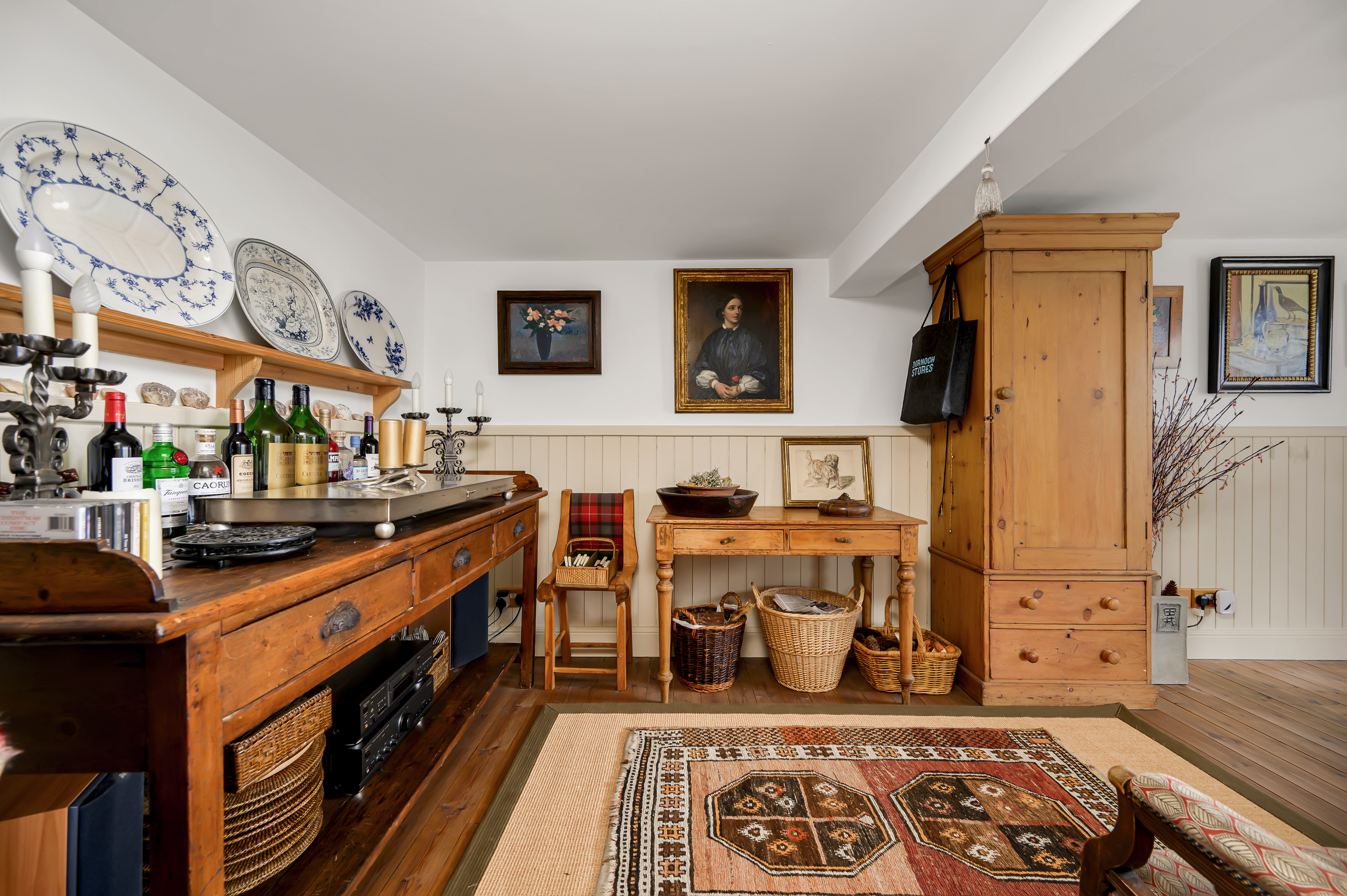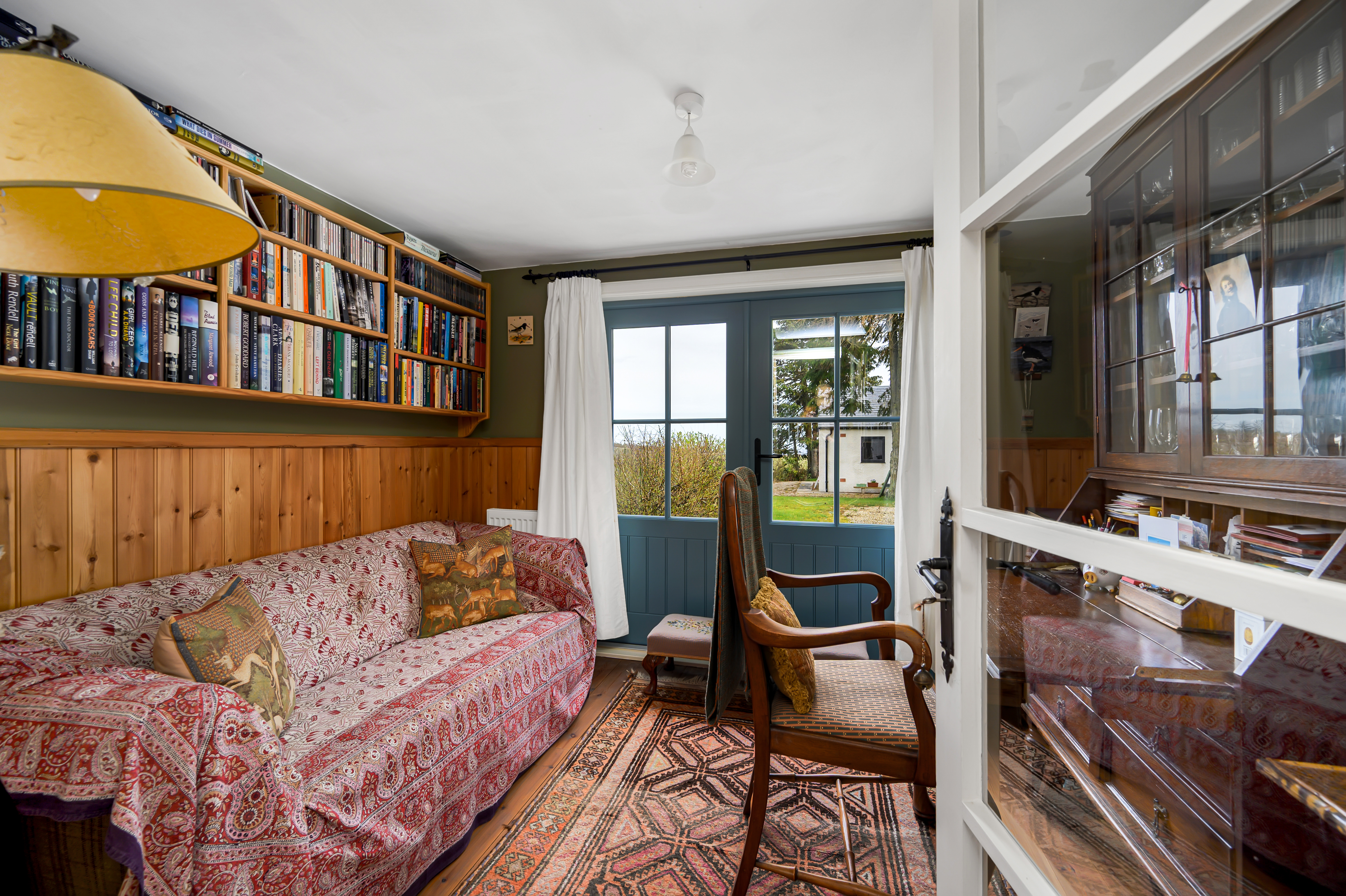 Allows access, through double external doors, out to the side of the property. Solid wood flooring. Walls partially lined with tongue and groove wood panelling. Wall mounted display book shelving. Radiator.