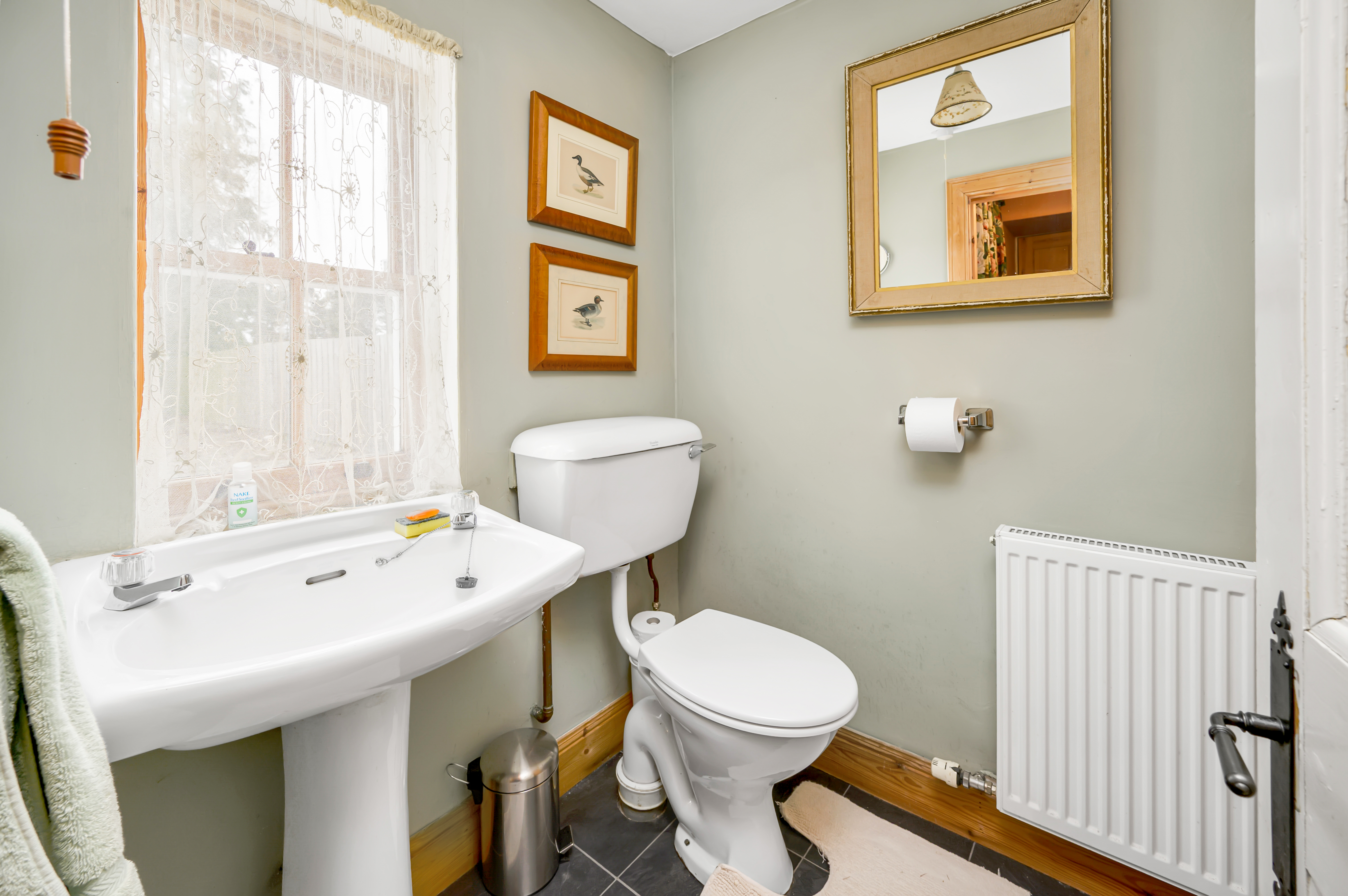 Comprising WC and wash hand basin. Side facing window. Amtico flooring. Radiator. Double doors lead through into a large cupboard housing a pressurised hot water cylinder.