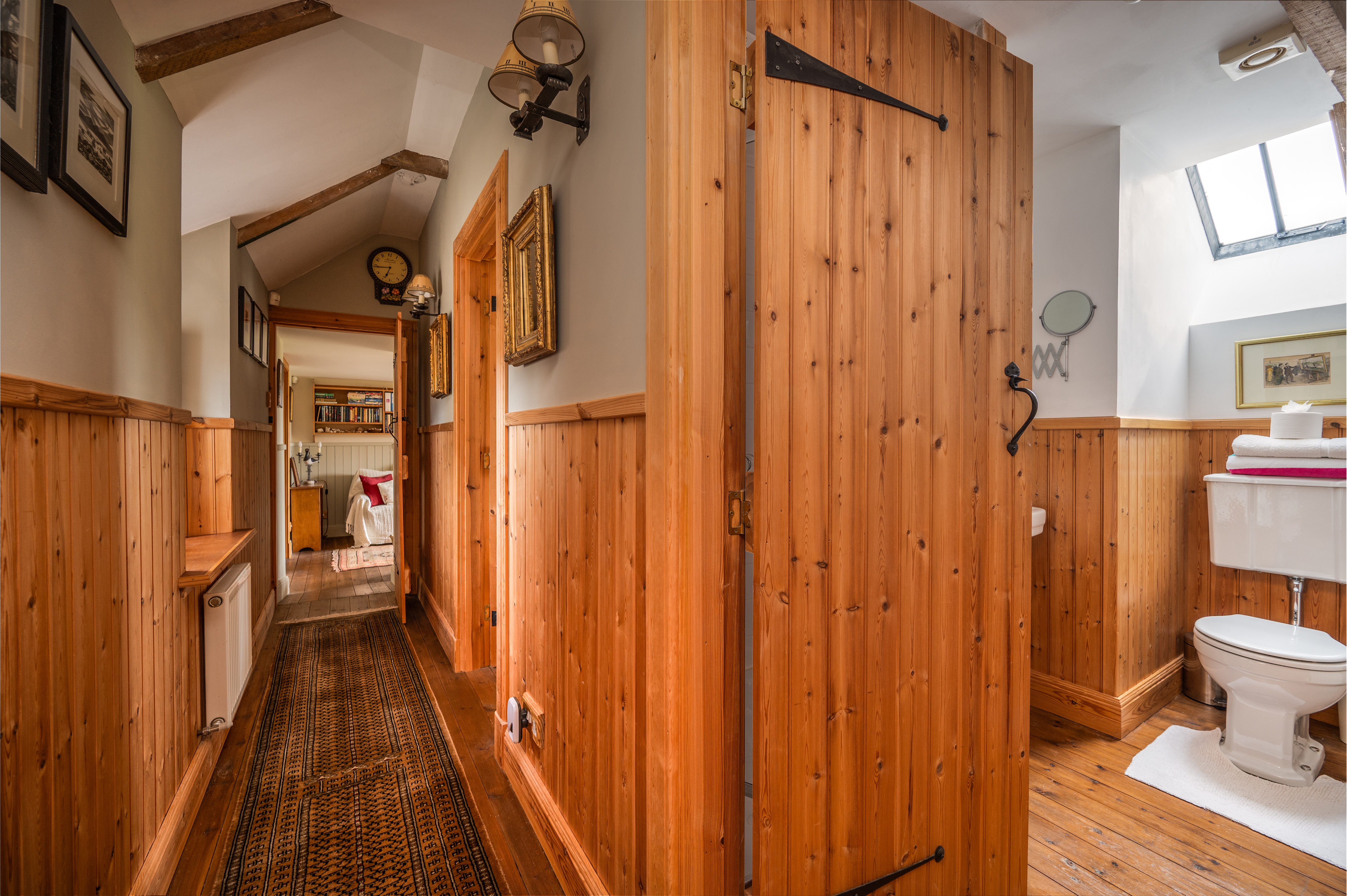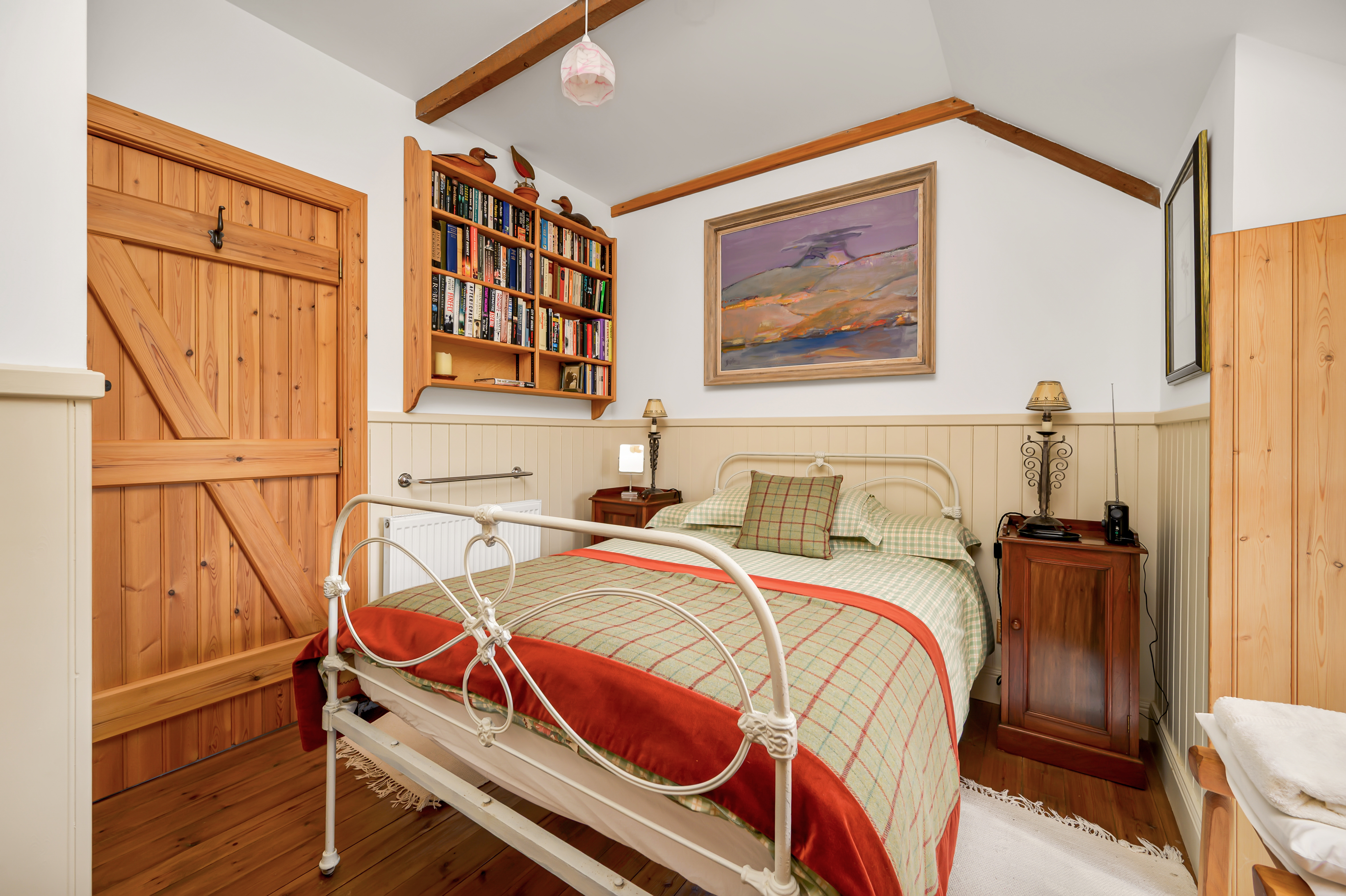 The landing has been fully lined with tongue and groove panelling, with hidden storage areas built in, and allows access to two further bedrooms and bathroom. A door leads into a cupboard allowing for further storage. Front facing Velux. Original wood flooring.