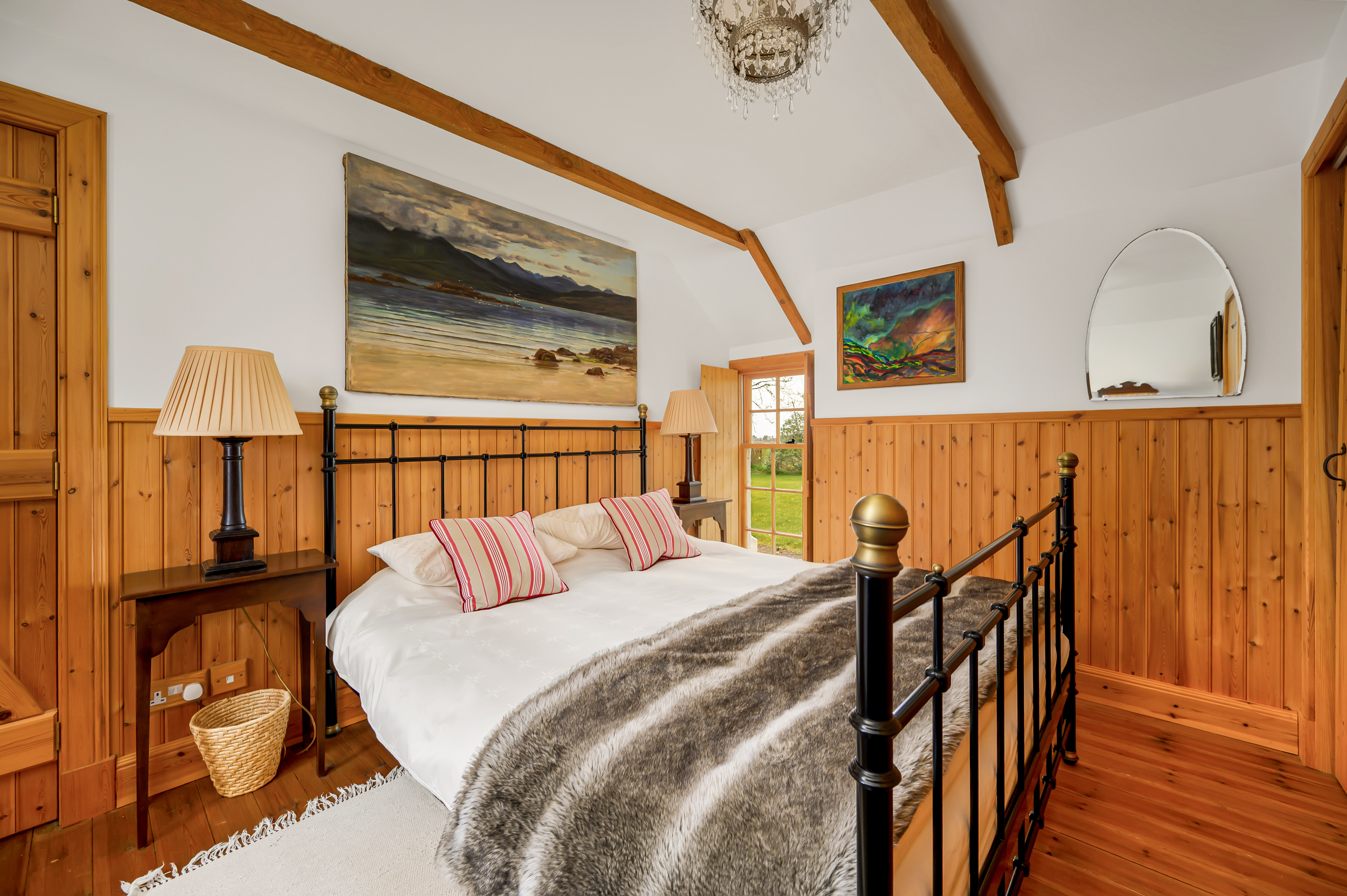 Enjoying a front facing window with open views across farmland towards the Dornoch Firth, this nicely proportioned bedroom has also been fully lined with tongue and groove wood panelling. Original wood flooring. Coomb ceiling which has also been fully lined with tongue and groove panelling. Cast iron fireplace with wood mantel. Wardrobe with hanging rail and shelf.