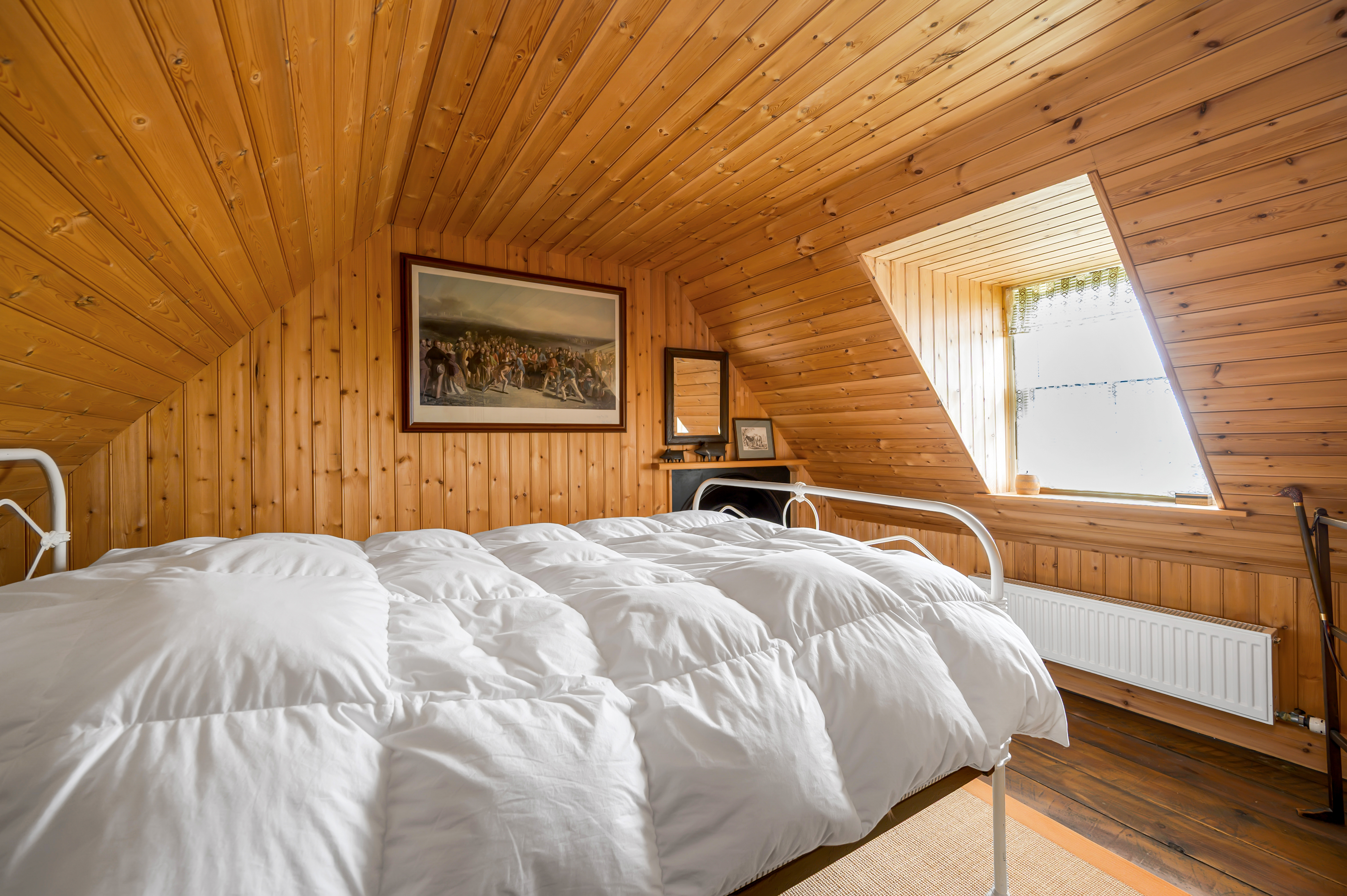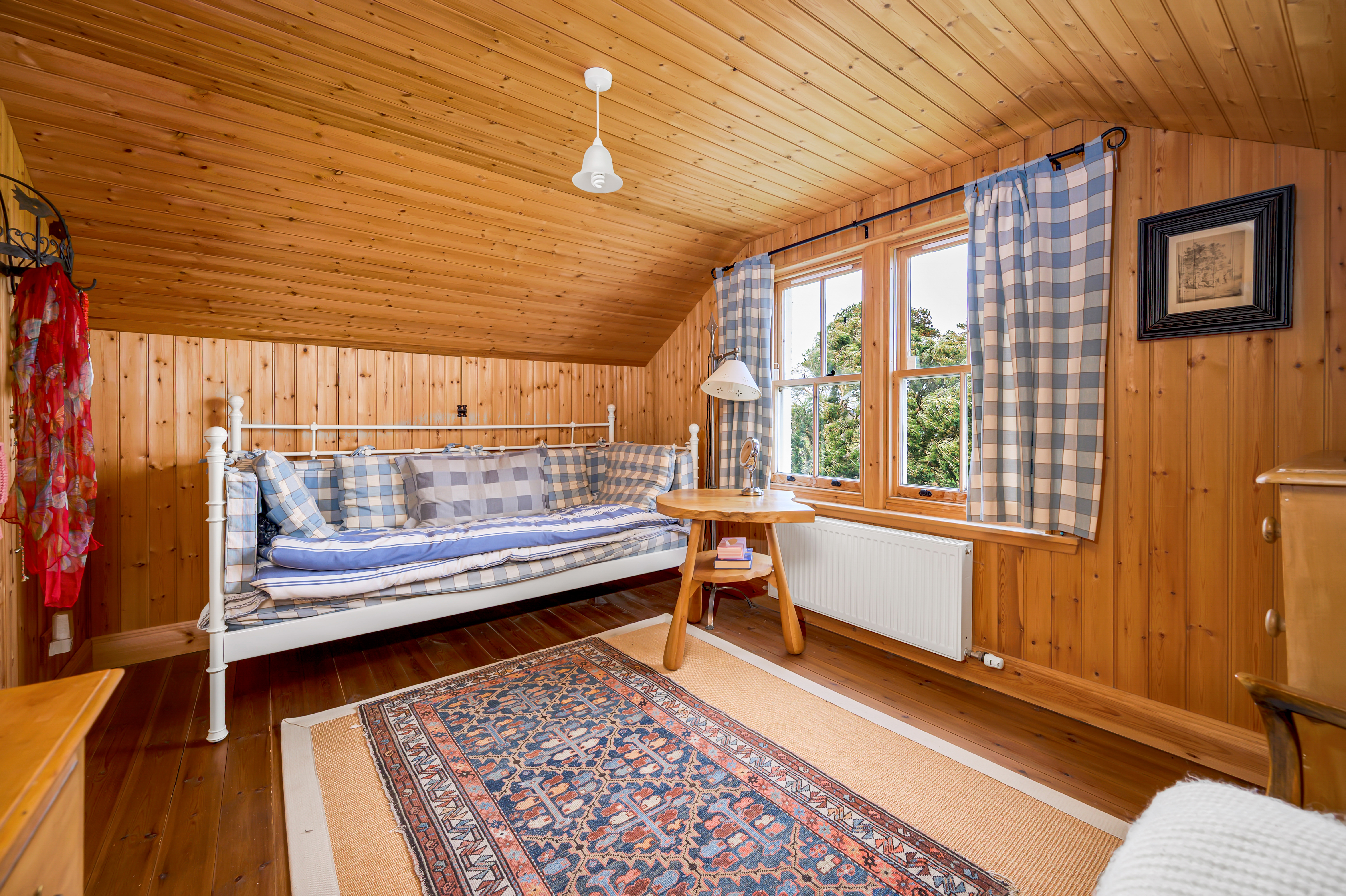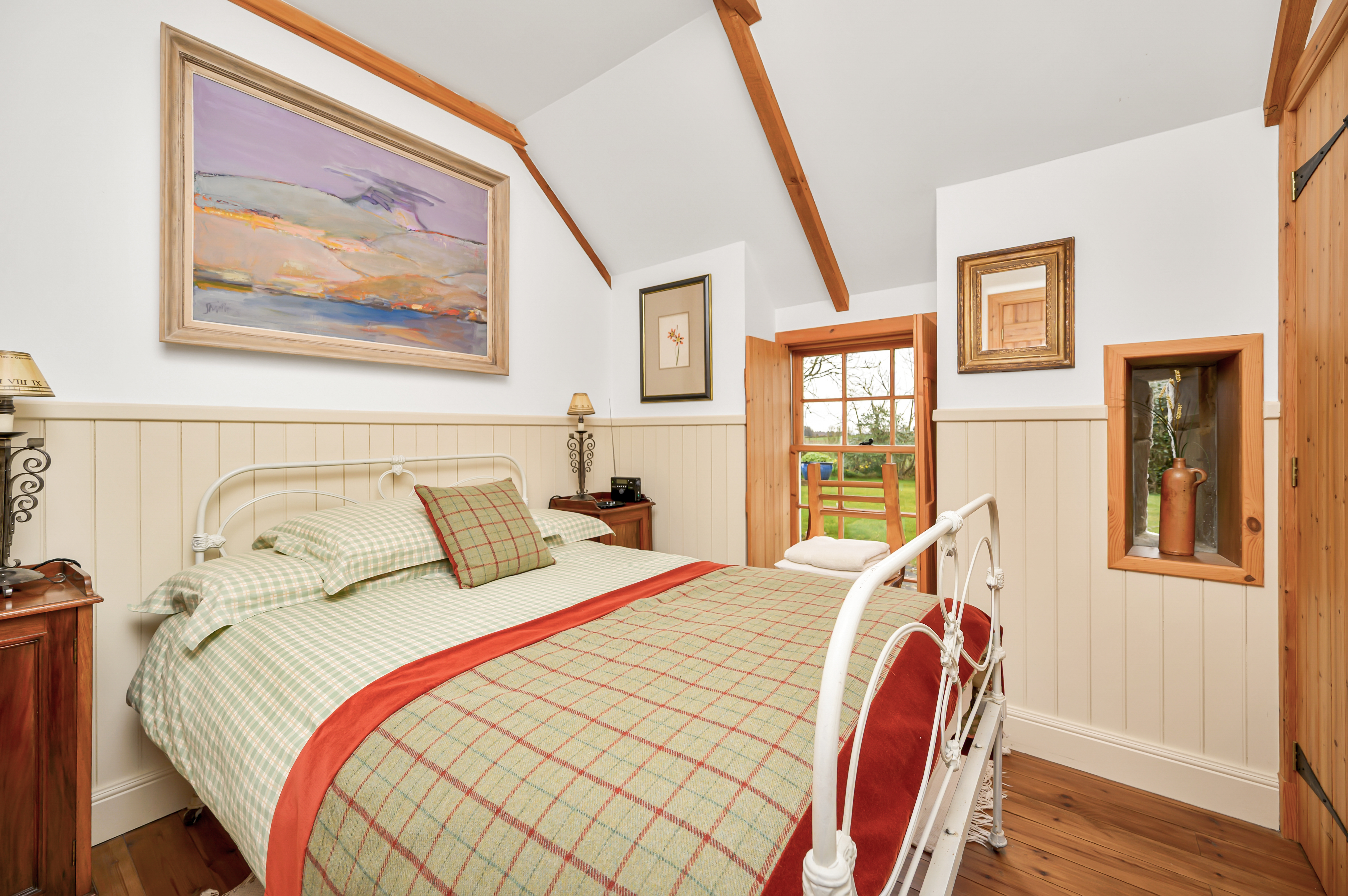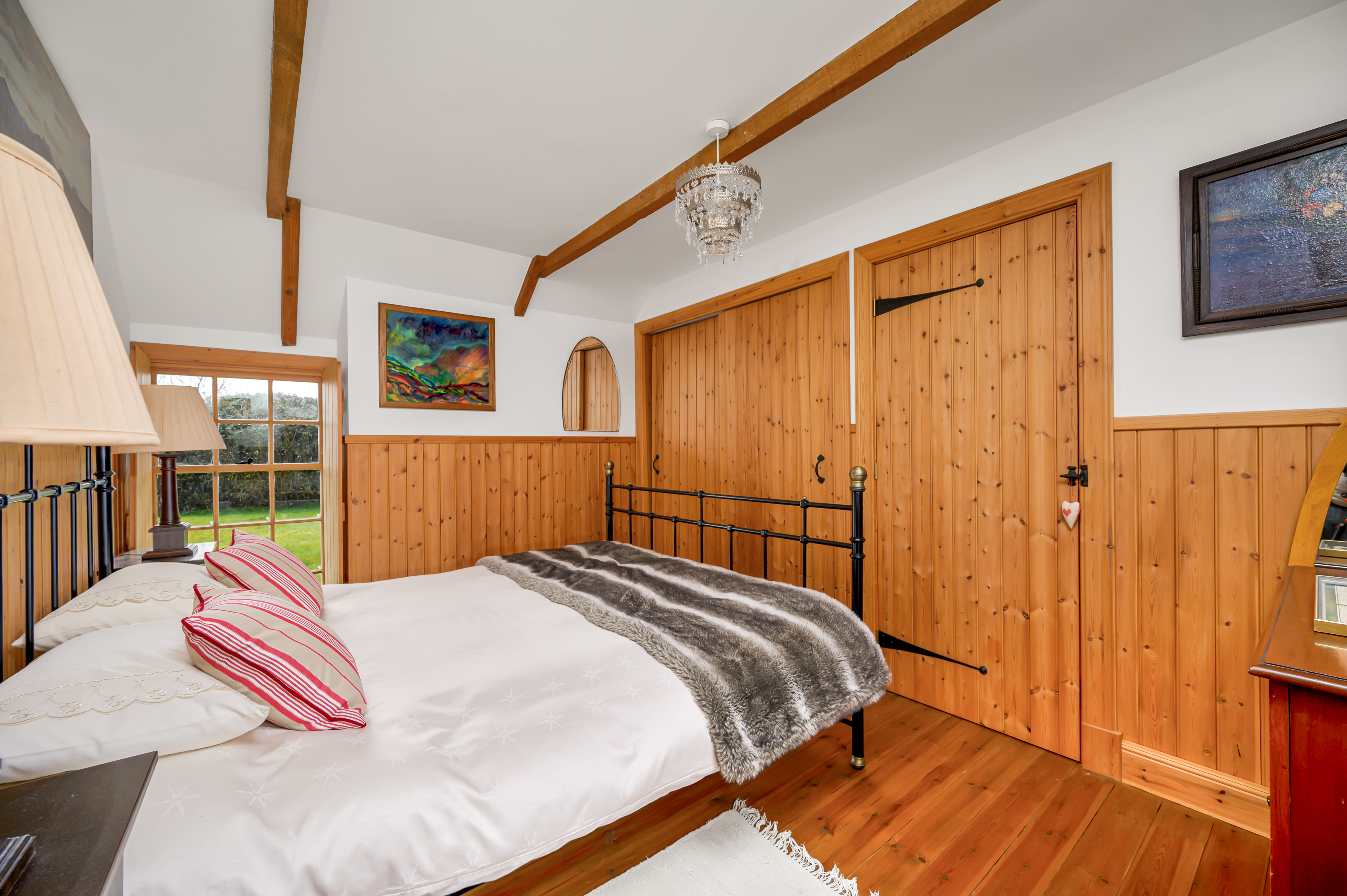 Fully lined with tongue and groove pine panelling this spacious room enjoys rear facing windows with open views across farmland. Solid wood flooring. Curtains. Radiator. Coomb ceiling. There are large hidden storage areas discreetly inserted behind the walls on both sides of the room.