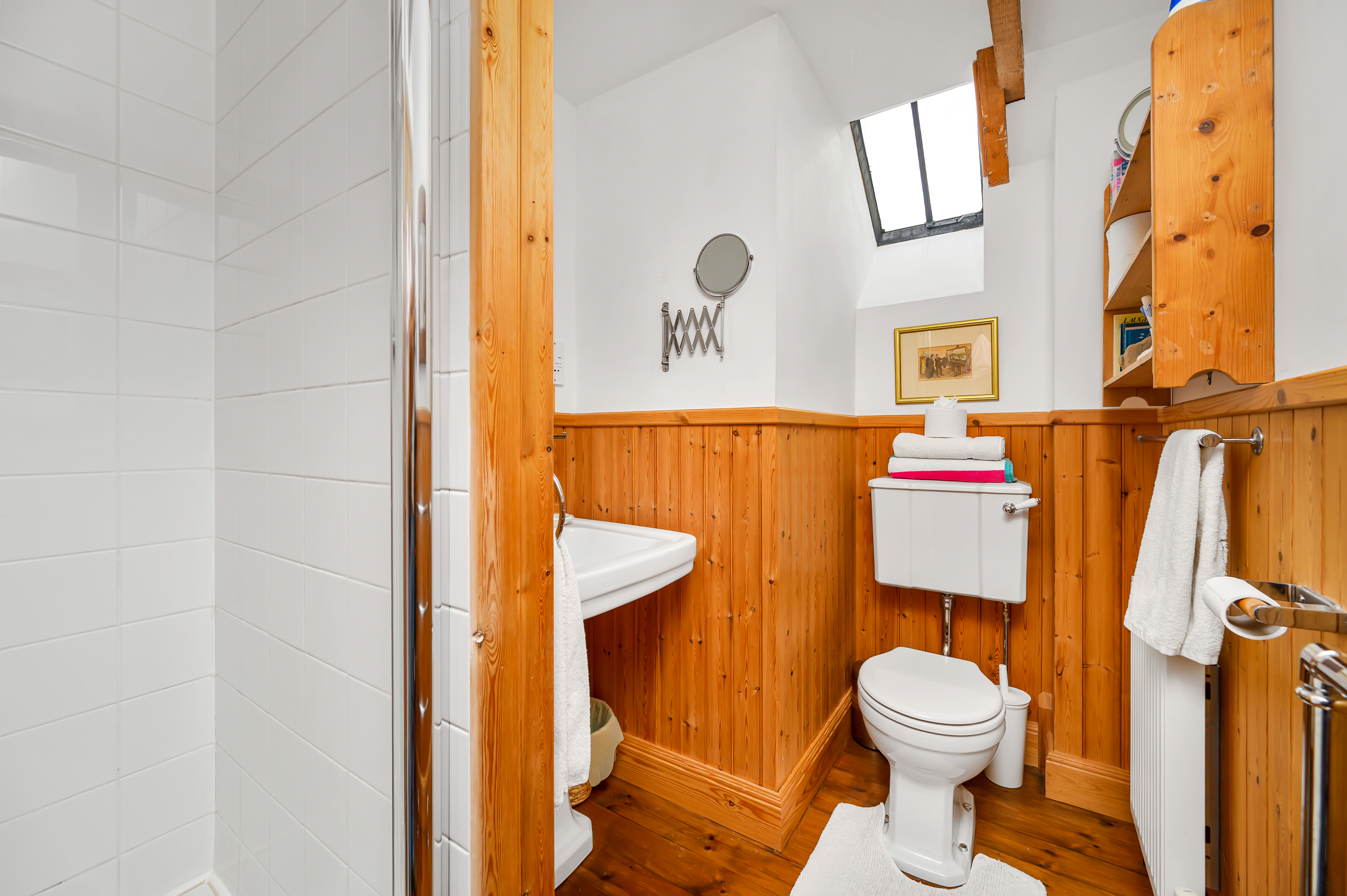 Comprising WC, wash hand basin and fully tiled shower cubicle. Walls have been partially lined with tongue and groove wood panelling. Exposed beams. Fitted wall unit. Wall and ceiling lights. Front facing skylight. Heated towel rail. Radiator. Solid wood flooring.