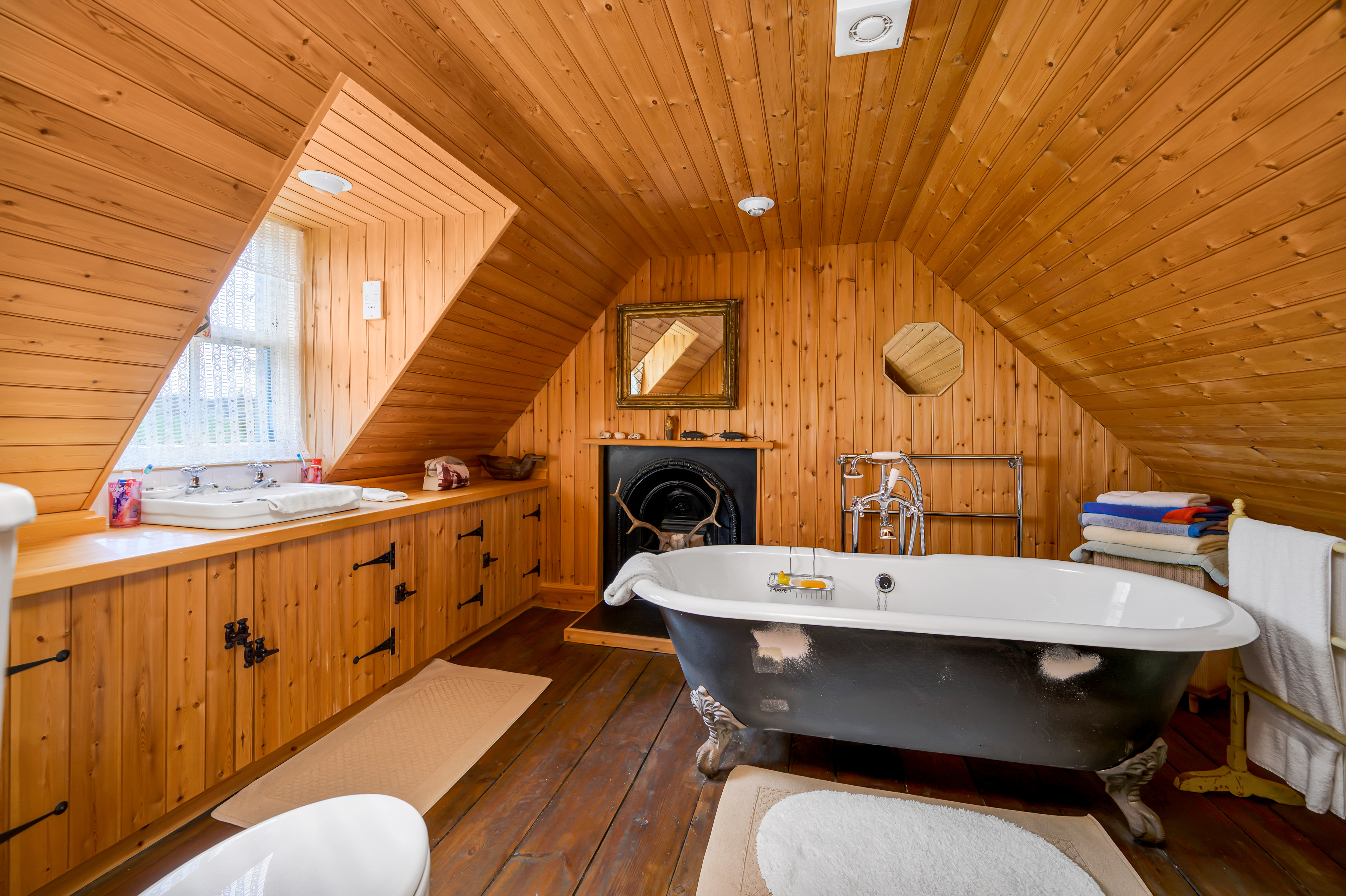 This beautiful, spacious bathroom has been fully lined with tongue and groove pine panelling and comprises a built in vanity wash hand basin set in a wooden work top with generous storage under, WC and freestanding bath. Cast iron fireplace adds an extra feature to this stunning bathroom. Front facing window with light above. Heated towel rail. Shaver socket. Pull out shaver mirror. Original wood flooring.
