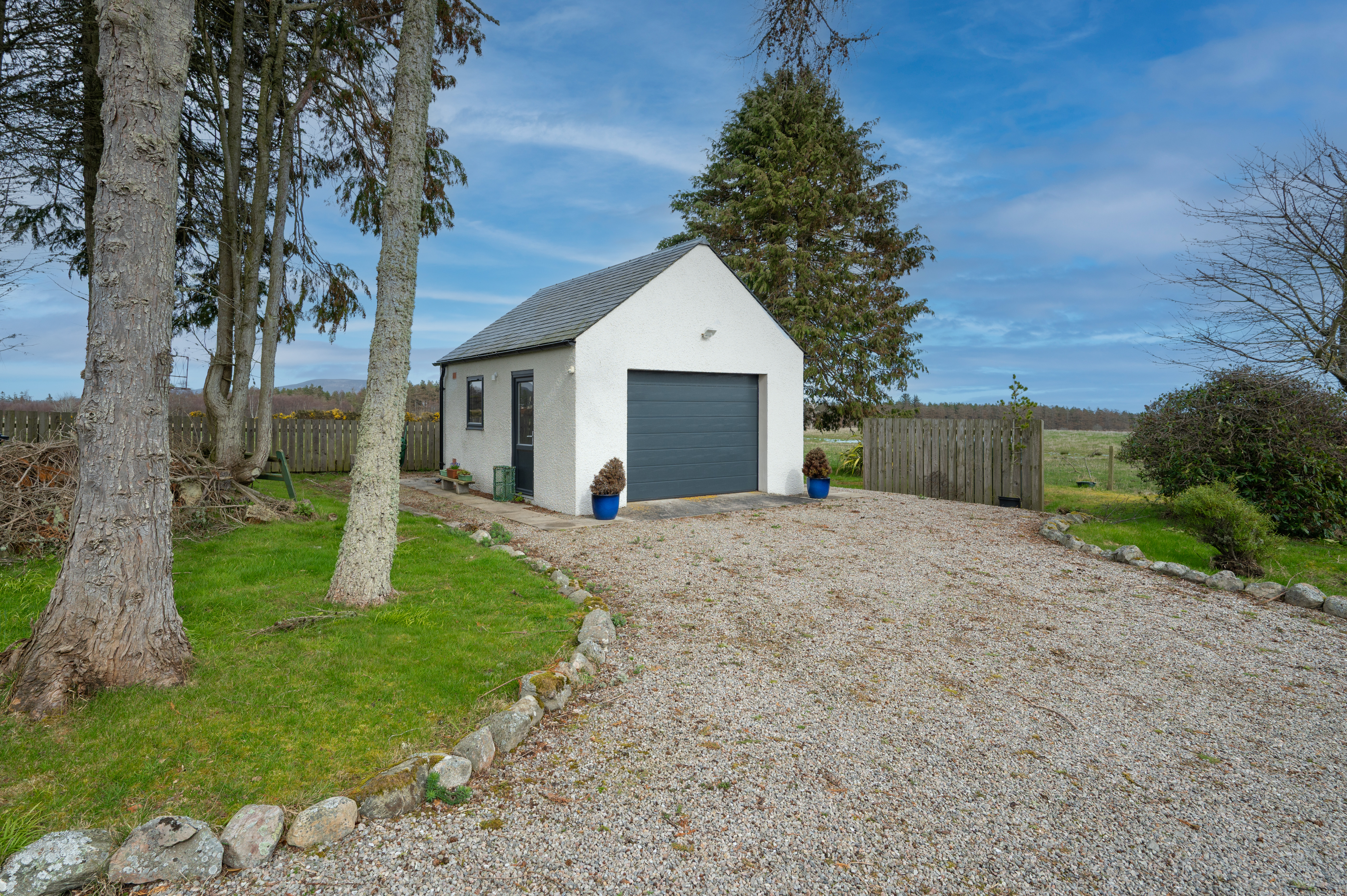The property sits in generous garden ground to the front, side and rear and are largely bounded by various fencing. An access track is provided off the A9 which leads to the property. Within the garden grounds there is a block built shed and wood store.