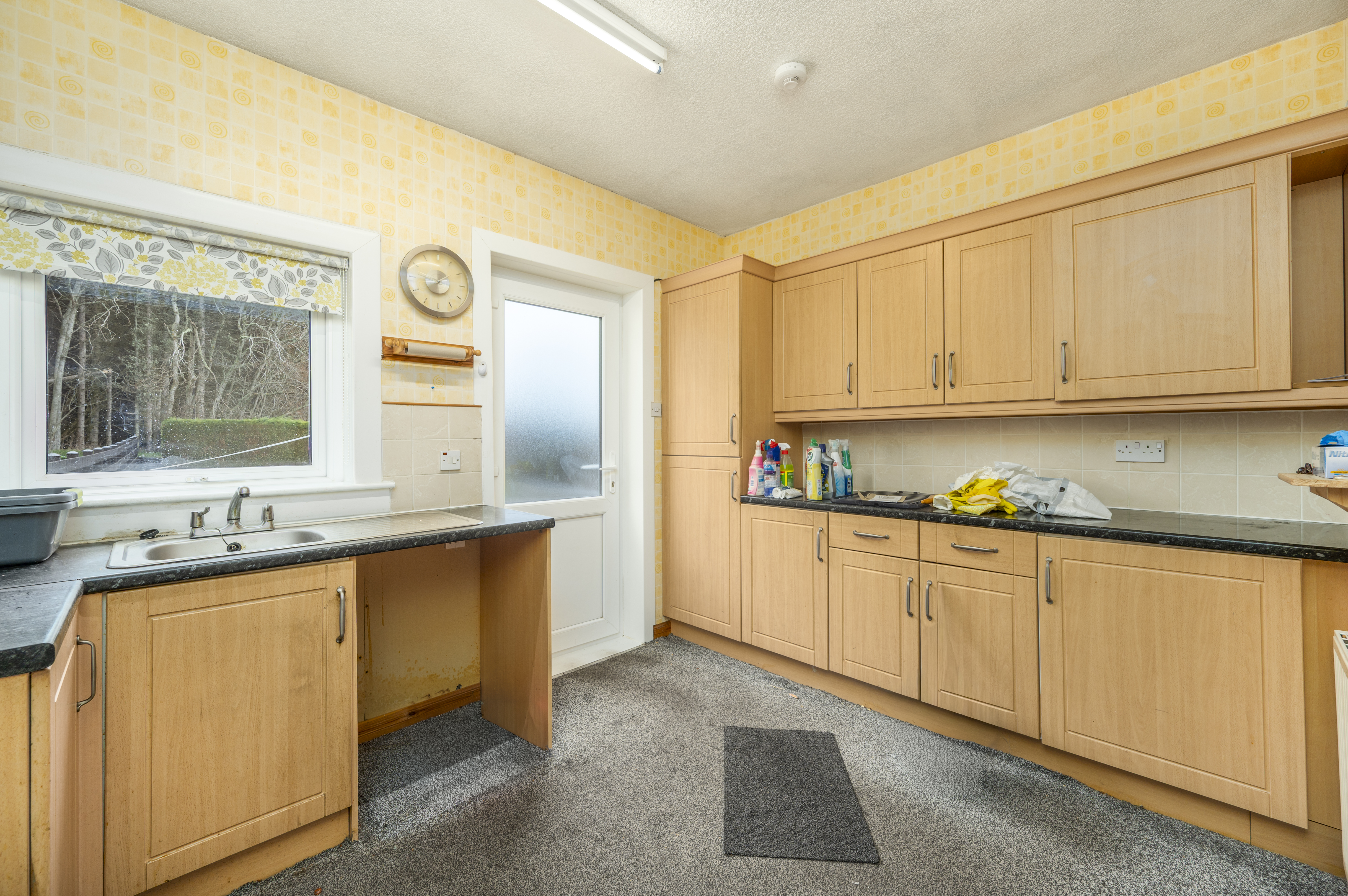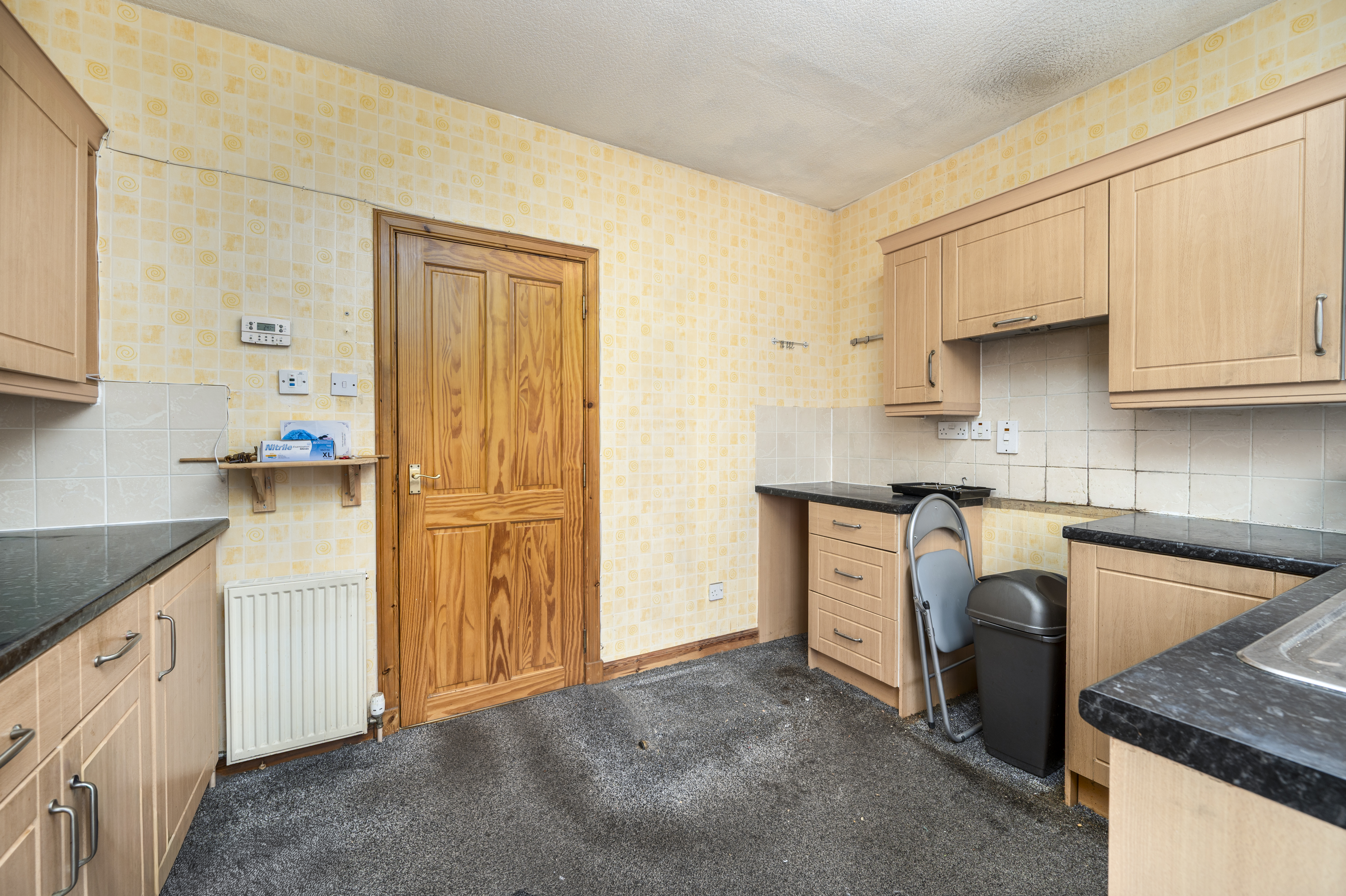 Fitted kitchen with a generous number of wall and base units incorporating a stainless steel sink and drainer with mixer tap. Space for free-standing cooker. Integrated extractor fan. Plumbed for washing machine. Radiator. Tiled splash-back. Rear facing window with fitted roller blind. Half-glazed UPVC door leads out to the rear garden.