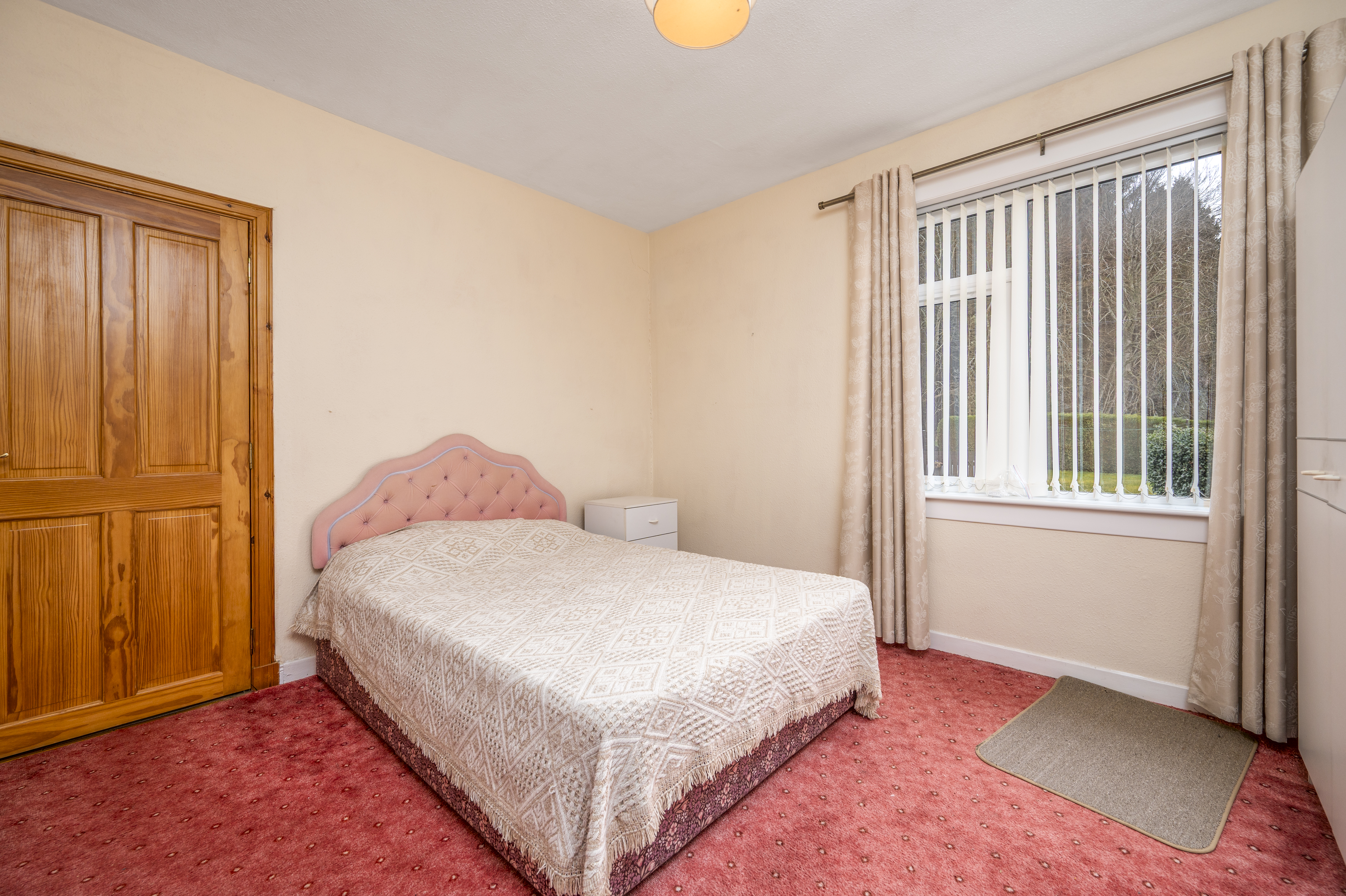 Nicely proportioned and bright bedroom with front facing window looking out towards Ben Bhraggie. Carpet. Curtains. Vertical blinds. Radiator.