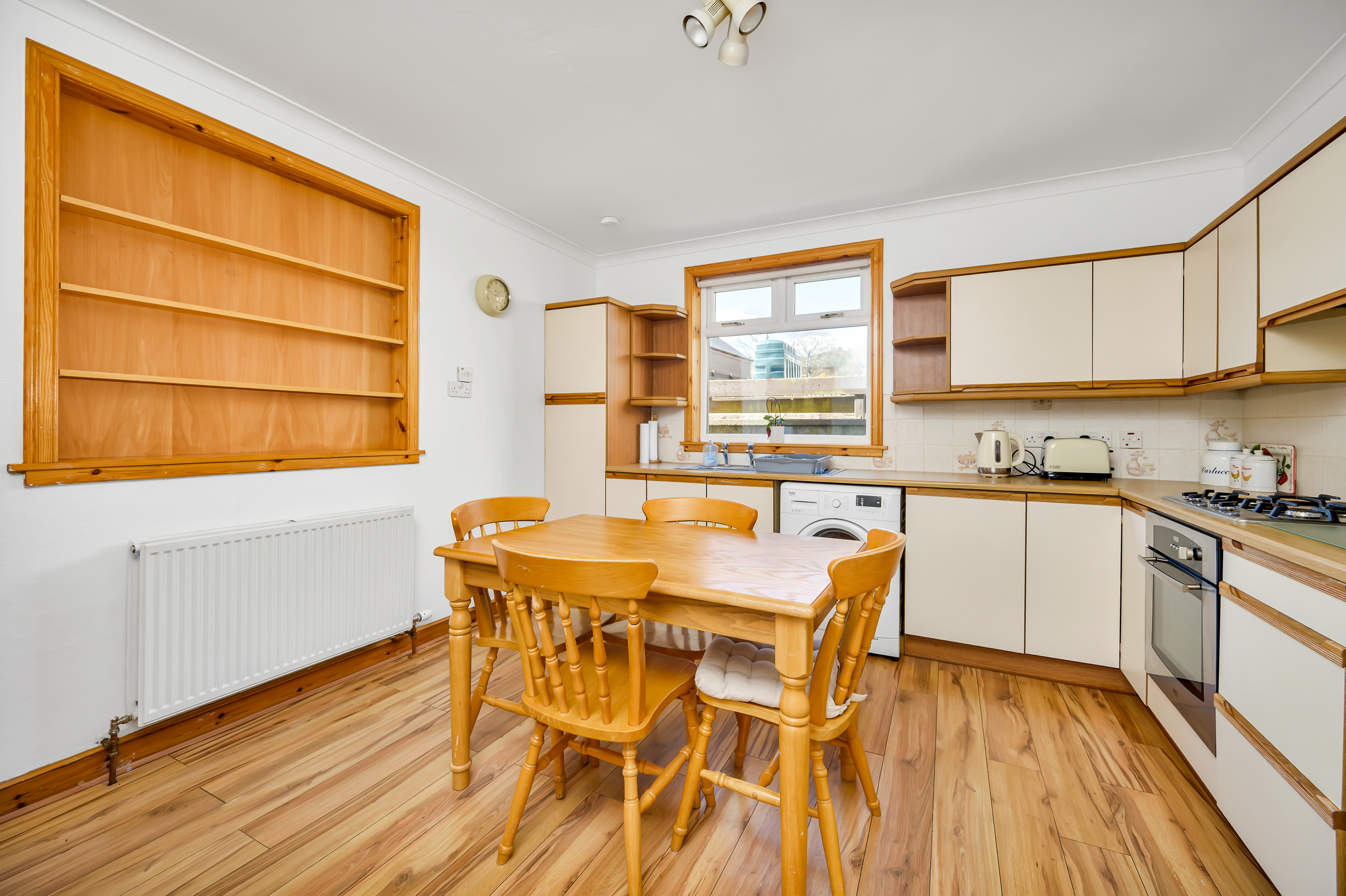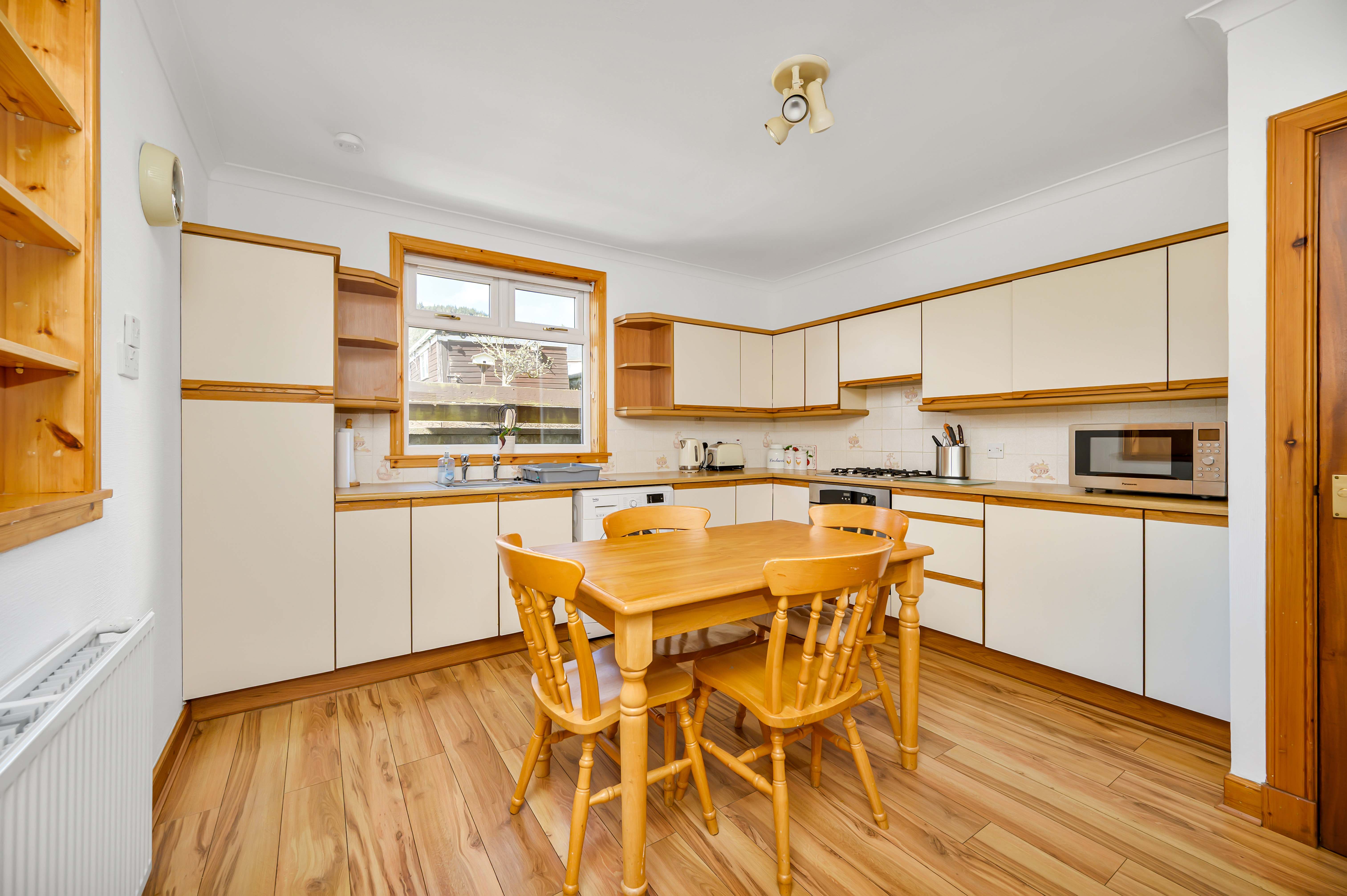 This bright kitchen comprises a generous amount of wall and base units and incorporates a built-in calor gas hob and oven. Stainless steel sink and drainer. Plumbed for washing machine. Generous work surface with tiled splash-back. Recessed wall shelving. Laminate flooring. Radiator. Rear facing window again enjoying views over the garden and across to Ben Bhraggie Monument. Door leads out to the side of the property.