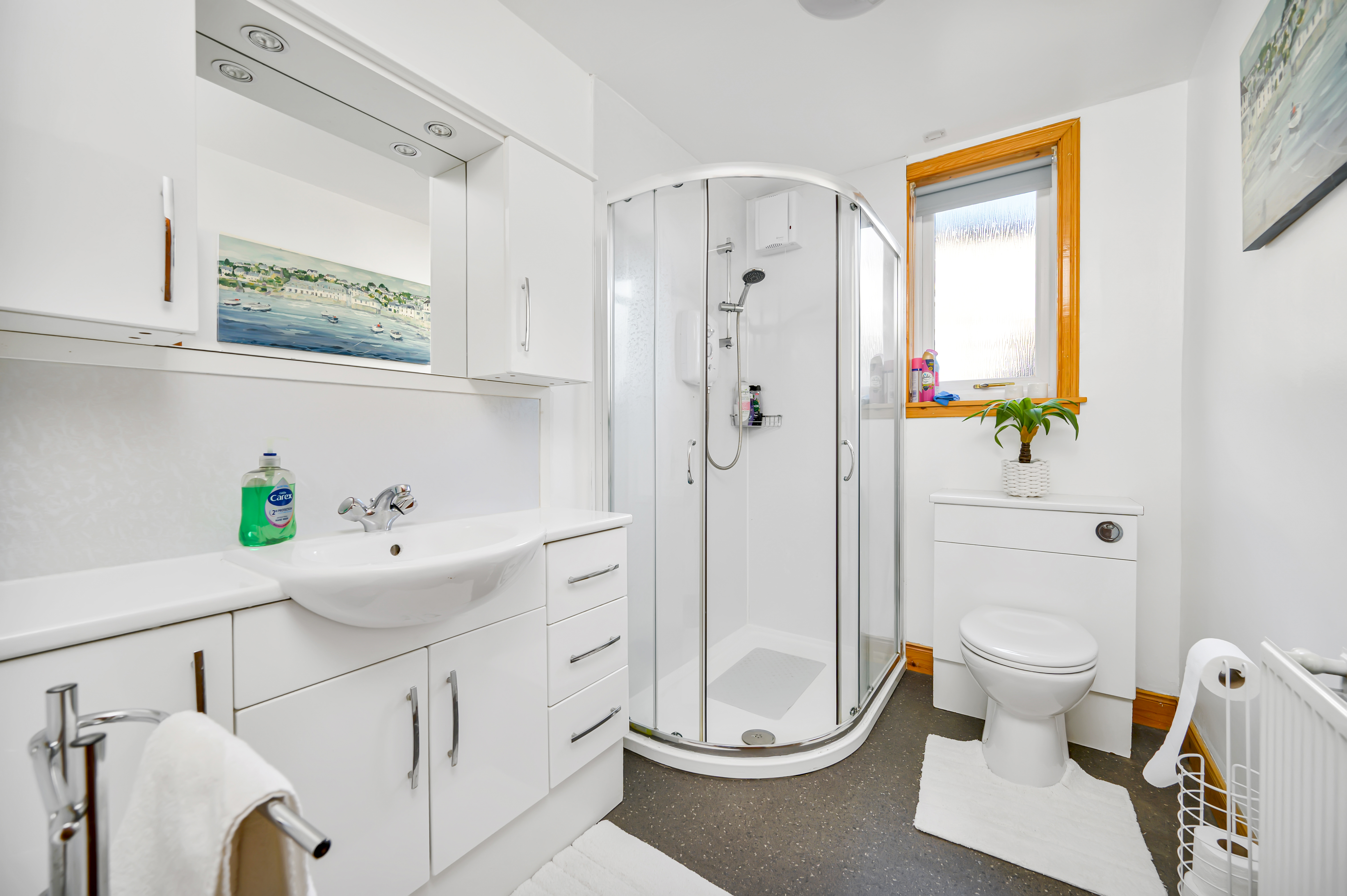 Comprising built-in WC with concealed cistern and wash hand basin set in a vanity unit with storage cupboards and drawers. Fitted wall unit with cupboards and mirror with LED lighting above. Shower cubicle, fully lined with wet wall panelling and fitted with a Mira shower unit. Non-slip flooring. Xpelair. Side facing window fitted with roller blind. Radiator.