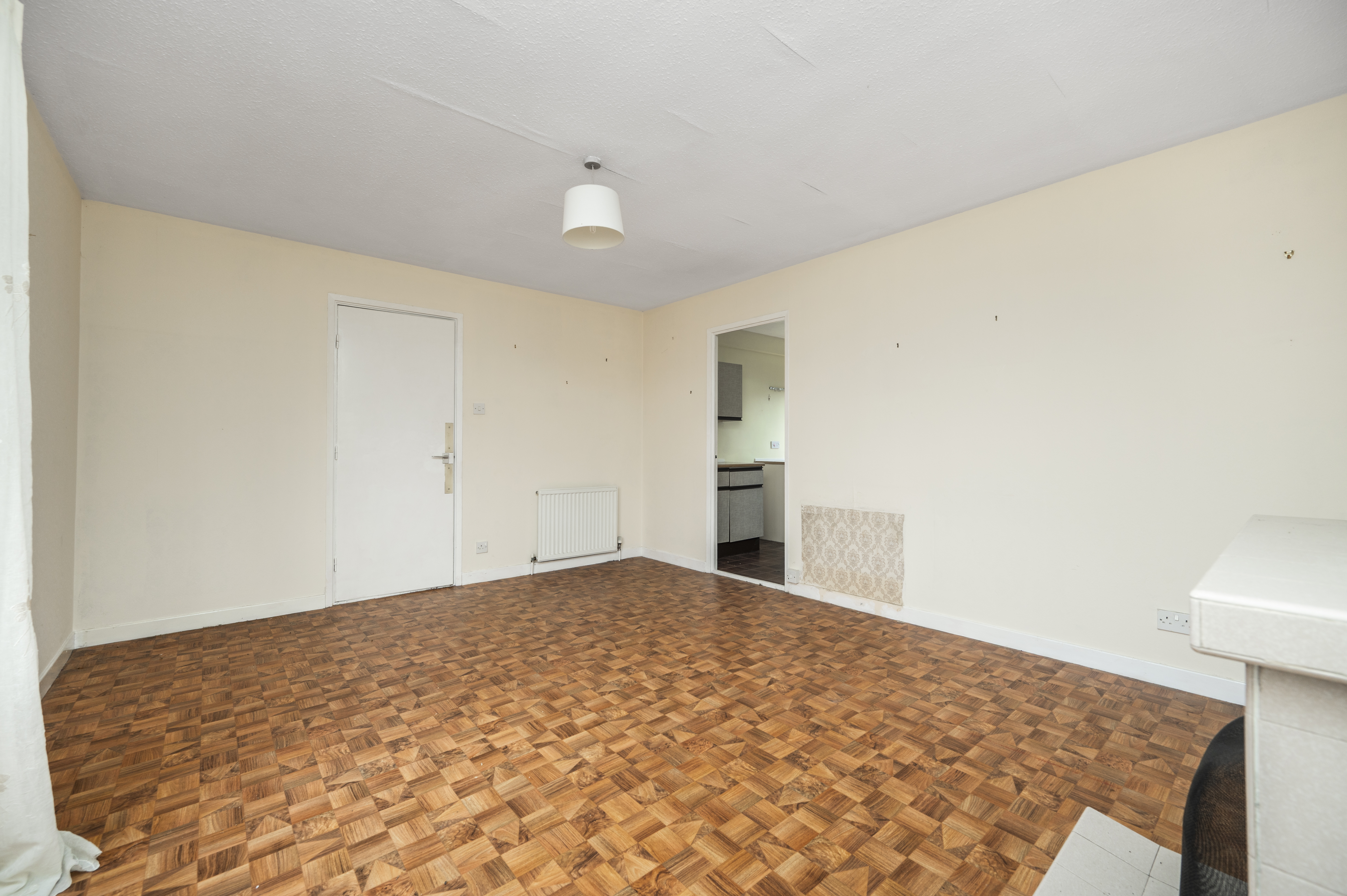Nicely proportioned room with front facing window enjoying views to the hills beyond. Tiled fireplace with open fire. Radiator. Vinyl flooring. Door through to kitchen.