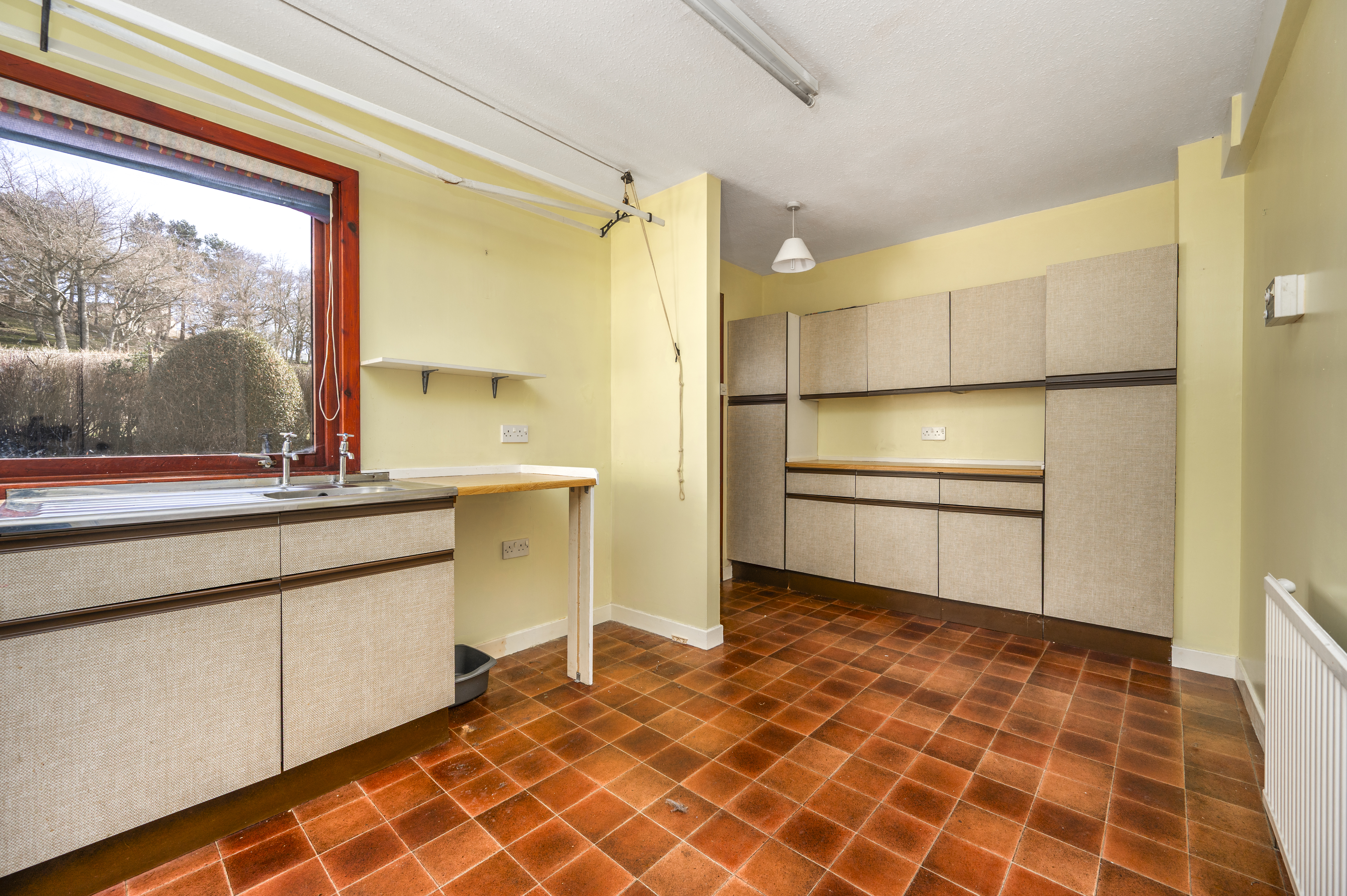 This fully fitted kitchen comprises a generous amount of wall and base units providing excellent storage and incorporates a stainless steel sink and drainer. Work surface. Space for free-standing cooker. Plumbed for washing machine. Ceiling mounted clothes pulley. Vinyl flooring. Rear facing window. Radiator. External door leads out to the rear garden.