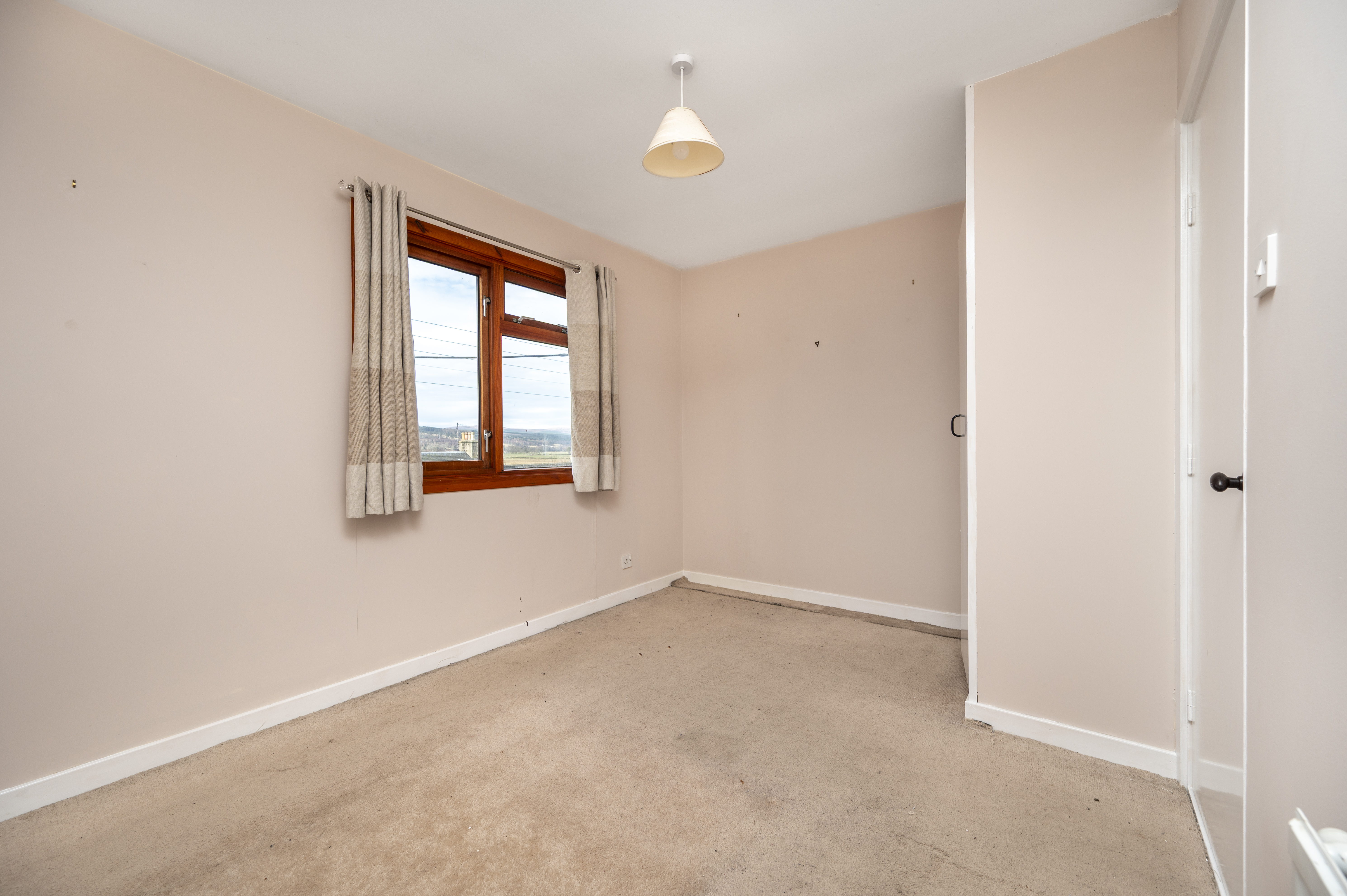 Nicely proportioned room enjoying a front facing window with views across to the hills beyond. Built-in wardrobe with double doors and small cupboard above, shelving and hanging rail. Carpet. Radiator.