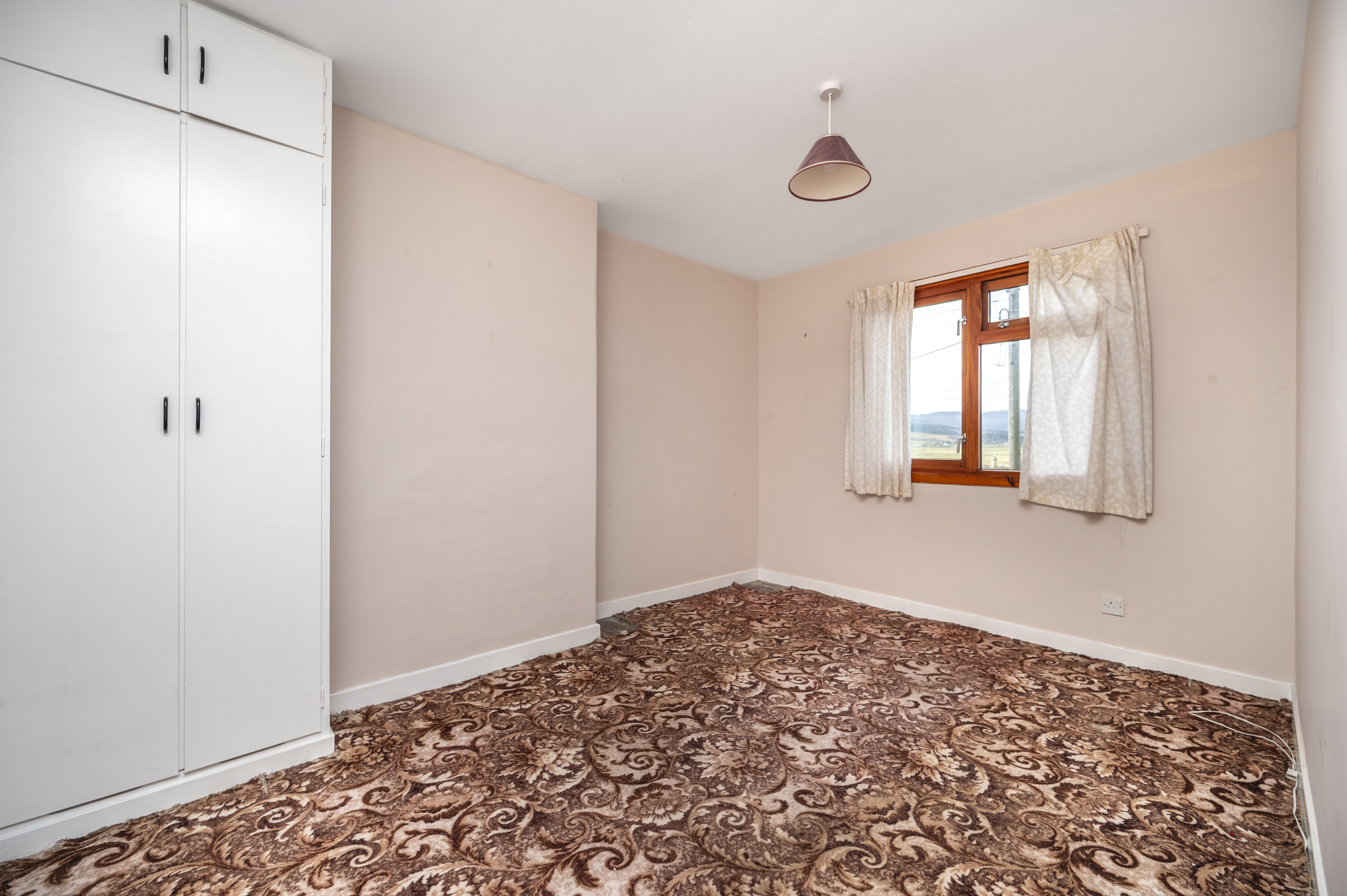 Another nicely proportioned room with front facing window enjoying views across to the hills. Built-in wardrobe with double doors and small cupboard above, shelving and hanging rail. Carpet. Radiator.