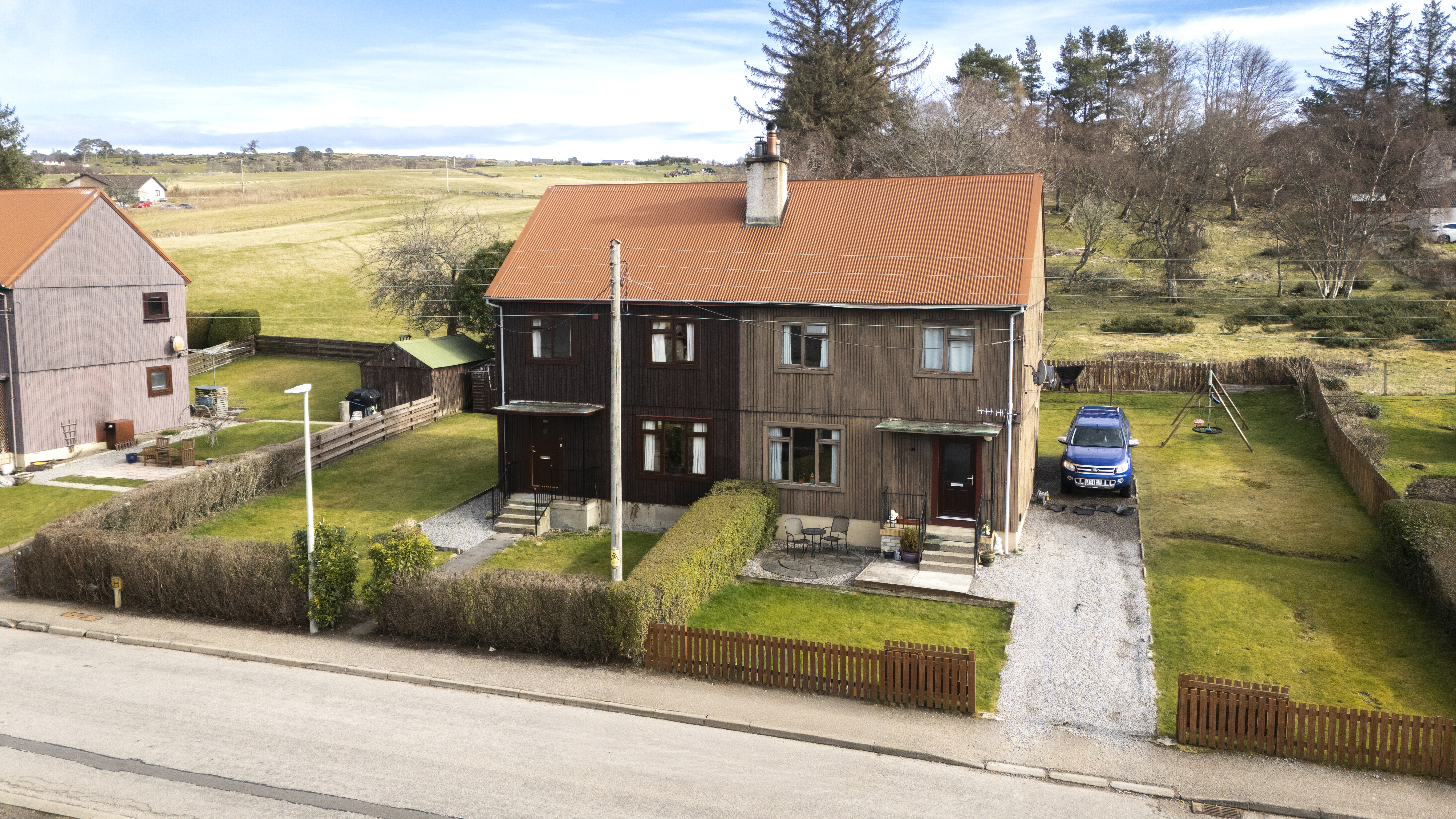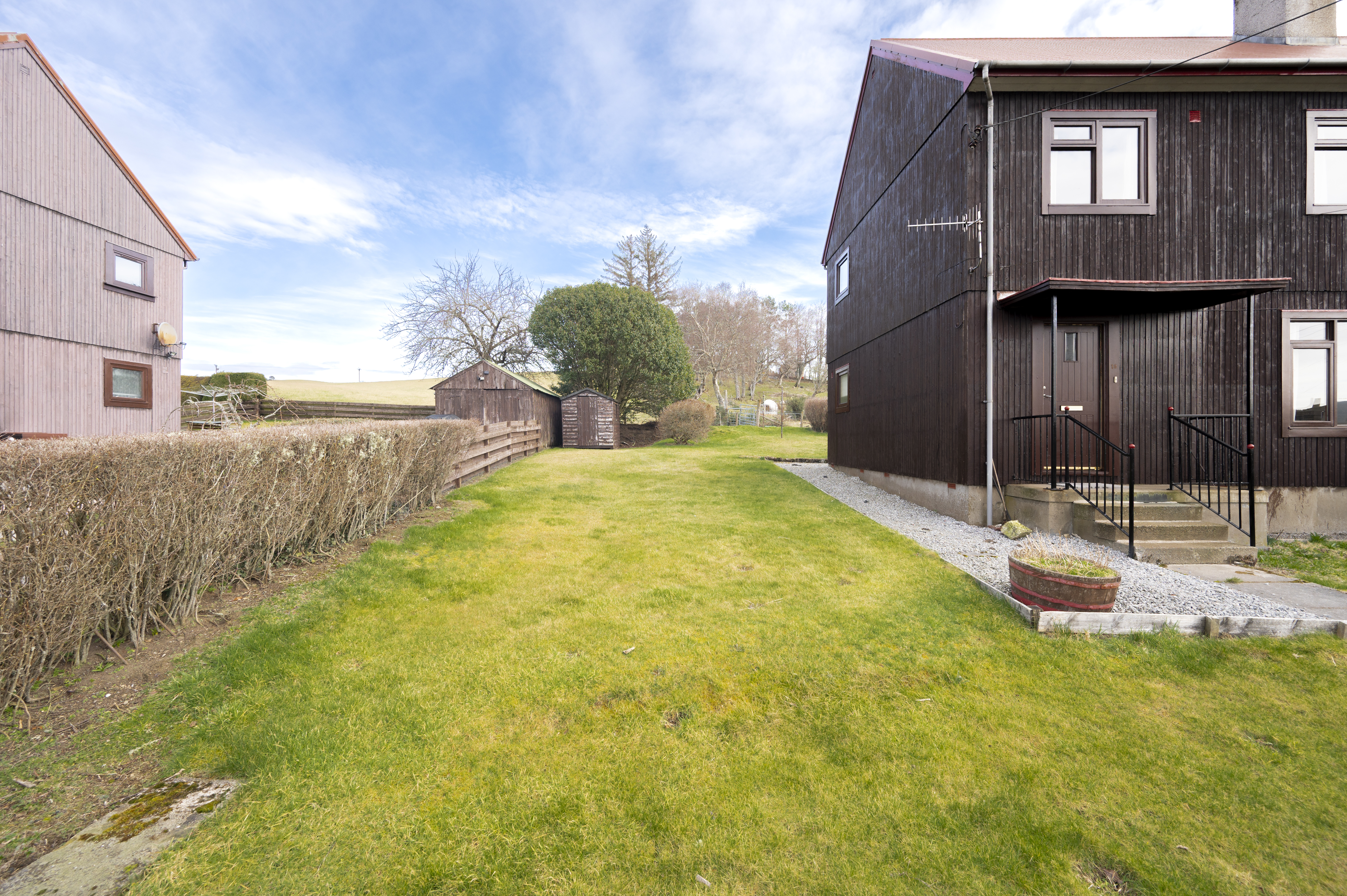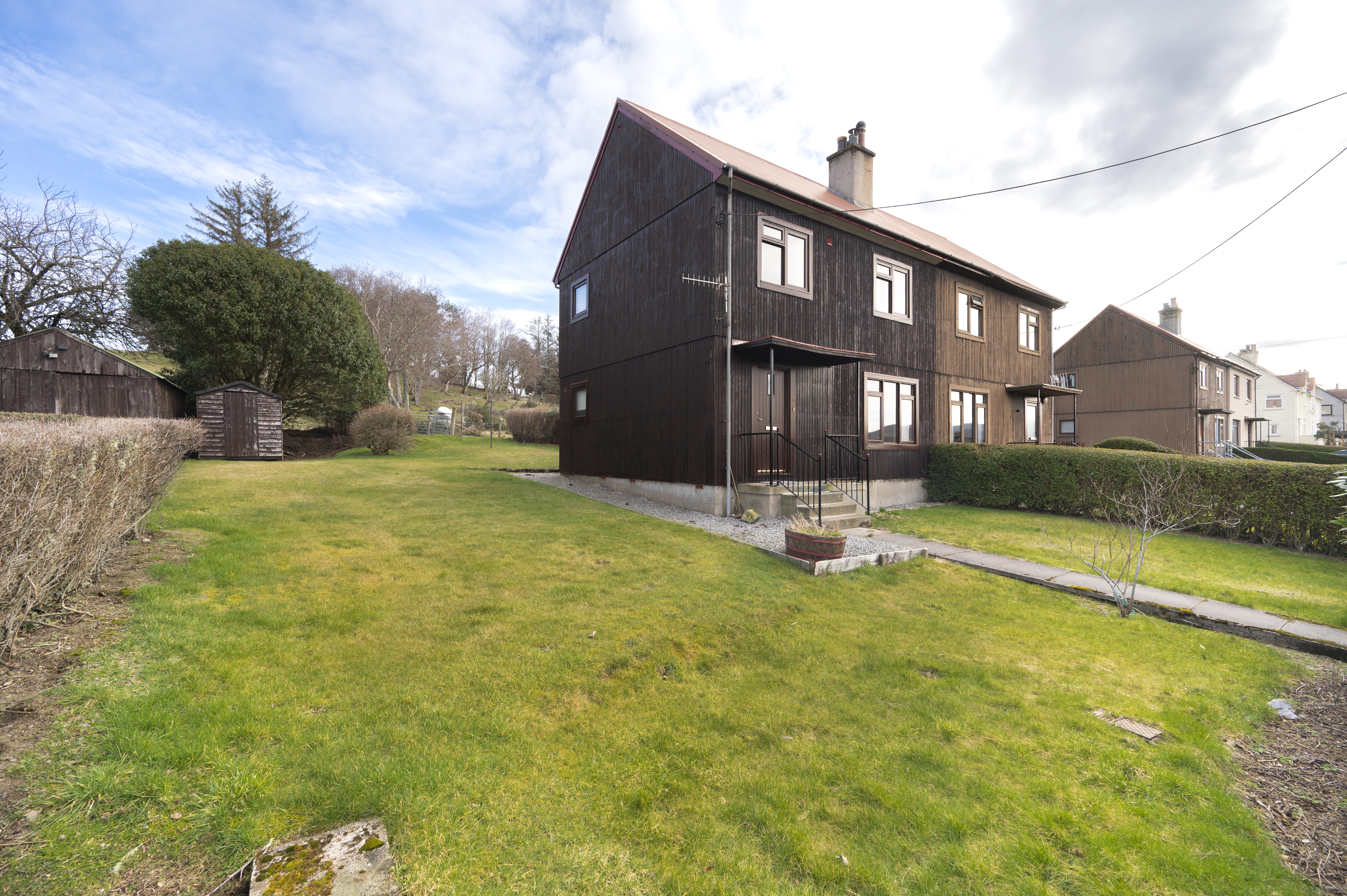 There are areas of garden ground to the front, side and rear which are laid to lawn for easy maintenance. A small timber garden shed is provided to the side of the property. Steps lead up to the front door.
